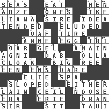 ACROSS 1. Oceans 5. Erode 8. Layer 11. Edge tool used to cut and shape wood 12. Singles 14. Mamie's husband 15. Climbing, woody, usually tropical vines 17. Father 18. It may be bright or harebrained 19. Watched over 21. Evaded 23. Clumsy lout 25. Hoop that covers a wheel 26. Queen of England 1702-14 27. Oval reproductive body of a fowl 28. Three (prefix) 31. Boat paddle 33. Set 35. At full speed 37. Hindu god of fire 38. Apply (a substance) by light strokes 40. Spanish pot 41. Covering 43. Large 45. To sift 46. Car or cant ending 47. Followers of ems 50. Have the gumption 52. Writer Wiesel 53. Health resort 54. Slanted 56. One or the other of two 61. (Had) reclined 62. To provide with a ceiling 65. Trap for birds or small mammals 66. Epoch 67. 4th largest of the Great Lakes 68. NW Algerian seaport 69. Title for a knight 70. Be seated 71. "Change" in Tahitian DOWN 1. Table seasoning 2. Singer Brickell 3. Muslim summons to prayer 4. Post 5. Greek goddess of the dawn 6. Black tropical American cuckoo 7. Cylindrical with tapered ends 8. Flintstone garb 9. Made supply last 10. Teachers' org. 13. Major League Baseball Commissioner Bud 16. A really long time 18. Binary compound 20. Mild oath, euphamism for damn 22. Capital and largest city of Mongolia 24. Nourish 26. Roberta Peters solo 28. Falsehood 29. Cause heat under the collar 30. _ tizzy (2 wds.) 31. Stare at amorously 32. Soon (poet.) 34. Experiment locale 36. Greater amount 37. Adept person 39. Auction offers 42. Seaweed 44. Stare wonderingly 48. Sibling's daughter 49. Spring feasts 51. Precipitation 52. Age 54. Indian skirt 55. One who doesn't tell the truth 57. A blast of a horn 58. Israeli folk dance 59. He sold his birthright 60. Painter Guido (1575-1642) 61. French article 63. One more than two 64. Allow