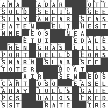 ACROSS 1. Santa ___, CA 4. The sixth month of the Jewish calendar 8. Baseball player Mel 11. Disposed of to a purchaser 13. Major League Baseball Commissioner Bud 15. Unit of force equal to gravity 16. Kill 17. Approach 18. Oceans 19. Ingested 21. Connecticut Ivy Leaguer 22. Command 23. Compass dir. 24. Greek goddess of the dawn 27. Teachers' org. 29. Needle case 30. Peak District village in England 34. Layer 36. Pate de foie ____ 39. Ms. Damita and namesakes 40. Sweet dark-red dessert wine 41. Phone greeting 43. Immeasurably long periods of time 44. Excessive but superficial compliments 46. Thick slice 47. Perceive with the eye 48. Carrier 49. Water vessel 51. Atmosphere 53. Elected rep. 54. Begley and Asner 57. Patter 60. Bear (Spanish) 63. Artist's stand 65. Like ___ of sunshine 66. For Whom the Bell _____ 69. Yard entry 70. Personal Computers (abbr.) 71. Saint headwear 72. Made supply last 73. Fast jet (abbr.) 74. Assign a rank or rating to 75. Big collection agency DOWN 1. NE Netherlands city 2. Pitcher Ryan 3. Having winglike extensions 4. White ___ sheet 5. Lair 6. Toward shelter 7. Monetary unit of Yemen 8. Double curve, resembling the letter S 9. Beverages made from leaves 10. Trial 12. Color 14. Amused look 18. Most questionable 20. Fish or hair follower 25. Ending for "Through" and "Enough" 26. Founders of families 28. Snakelike fish 29. Plea 31. Medicinal plant 32. Actor's bit 33. Double-curved letter 34. Like (prefix) 35. Part of Q.E.F. 37. Everything 38. Thick slices 40. Pacific Standard Time (abbr.) 42. Mitch Miller's instrument 45. Medical imaging device (abbr.) 50. A saturated hydrocarbon 52. Writer of Portnoy's Complaint (1969) 54. 1973 Nobel Price Winner (Physics) Leo 55. Prevent from occurring 56. Bobsleighs 57. Smile enhancers 58. Arches 59. Political cartoonist Thomas 61. Fly high 62. Water jar 64. Personal question 67. Car dealer's back yard 68. Compass dir.
