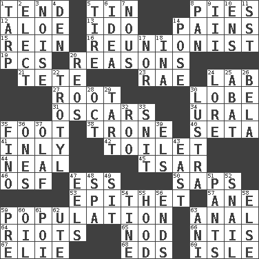 ACROSS 1. Look after 5. Shallow baking pan 8. Sliced desserts 12. Medicinal plant 13. Wedding promise 14. Aches 15. It's straight from the horse's mouth 16. One who advocates reunion 19. Personal Computers (abbr.) 20. Thinks logically 21. Wig 23. Actress Charlotte 24. Experiment locale 27. Carrot, for example 30. Ear part 31. Motion picture awards 34. Mountain range 35. Pick up the tab 38. Heavy duty weighing machine 40. Stalk of a moss capsule 41. In an inward manner 42. Rest room 44. Actress Patricia 45. Russian ruler of old 46. Order of Saint Francis (abbr.) 47. Double-curved letter 50. Plant excrements 53. Curse 57. One (Scot) 59. Census information 63. Of or related to the anus 64. Disturbances 65. Allow head to fall sleepily 66. Nuclear Threat Initiatives 67. Writer Wiesel 68. Begley and Asner 69. Capri or Wright DOWN 1. Canvas cover 2. Voters do this 3. Annoying sound 4. Lair 5. Become fatigued 6. The main thing one is thinking about 7. Common sense 8. Baking dish 9. One more than two 10. Followers of ems 11. Fast jet (abbr.) 14. Introduce or present, as a question 17. And not 18. _ tizzy (2 wds.) 20. Vintage cars 22. TNT 24. Old wives' tales, e.g. 25. Blind as ____ 26. Actor Lugosi 28. Sep. follower 29. Small pie 30. A period of five years 32. Friend of Pooh 33. In a ____ (agitated or irritated) 35. Fine (Spanish) 36. Singles 37. Norwegian king 39. Raised railways 43. 90 degrees 47. Snakelike fish 48. Health resort 49. Be seated 51. Leg coverings 52. Slow-paced one 54. Prong on a fork 55. Parka part 56. Extremities 58. Otherwise 59. Before (prefix) 60. Lubricate 61. Luau course 62. Shoshoni 63. Black tropical American cuckoo