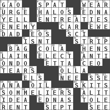 ACROSS 1. E Mali city 4. Argument over a trivial matter 8. Erode 12. Goad 14. Radiant circles of light 16. Pulitzer Prize-winning author Ferber 17. Shout 18. Pleas 20. Foe 22. 4-wheeled motor vehicle 23. She-sheep 24. Male parent 25. Greek goddess of the dawn 28. _-fi 30. Is not 31. Empty completely 35. Container for groceries 37. Root beer relative 40. Coop moms 41. (Had) reclined 42. Voters do this 44. Opposed to 45. Southwest Nigerian state 46. Singer James 47. Corporate head (abbr.) 48. Separates forcefully 50. Spanish pot 52. Raised railways 54. Born 55. Compass dir. 58. Santa ___, CA 61. Petroleum 63. Burlesque acts 65. Wine waiters 70. Came down and settled, as after flight 71. The main thing one is thinking about 72. Ferber et al. 73. Lacquered or enameled metalware 74. Monthly bill 75. Back-to-school mo. 76. Observe DOWN 1. Secured 2. Sports stadium 3. Stared at amorously 4. A female animal or person 5. Baking dish 6. Keyboard modifier key 7. Torque (variant) 8. Dripping 9. Singer Brickell 10. Afresh 11. To erase 13. Shade tree 15. Oceans 19. Curves 21. Consenting reply 26. Single time 27. Took without asking 29. New York city 30. Disregard 32. French philosopher Descartes 33. To the inside or interior of 34. Air pressure measure (abbr.) 35. Object of repulsion 36. Opera by Verdi 38. Allow 39. NE Massachussets city 41. Car dealer's back yard 43. Lie 49. _ gin 51. French article 53. Filth; sediment 55. Grain storage towers 56. Vertical member of a panel or frame 57. First name in cosmetics 58. SW Saudi Arabia district 59. Thickened enlargement 60. So be it 62. Hats (slang) 64. Krazy ___ of comics 66. Floor protector 67. Compass dir. 68. Reproach for some lapse or misdeed 69. Fast jet (abbr.)