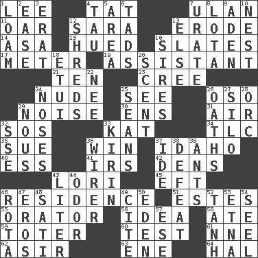 ACROSS 1. Area sheltered from the wind 4. Make lace 7. ____ Bator, Mongolia 11. Boat paddle 12. "Two Mules for Sister ____" 13. Wear away 14. White ___ sheet 15. Took on color 16. Chalkboards 17. Distance measurement 19. Aide 21. Nine, plus one 23. Algonquian 24. Naked 25. Observe 26. Bear (Spanish) 29. Annoying sound 30. Followers of ems 31. Wind 32. Mayday 33. Krazy ___ of comics 34. Affectionate concern, for short 35. Take to court 36. Victory 37. Potato state 40. Double-curved letter 41. Big collection agency 42. Lairs 43. Australian parrot (variant) 45. Bank Draft (abbr.) 46. Dwelling 51. _____ Park, CO 55. Speaker 56. The content of cognition 58. Had dinner 59. Carrier 60. Trial 61. Compass dir. 62. SW Saudi Arabia district 63. Compass dir. 64. Actor Linden DOWN 1. Rich soil 2. Comfort 3. Part of Q.E.F. 4. The 19th letter of the Greek alphabet 5. Type of rug 6. Small boys 7. A salt of uric acid 8. Globular water bottle used in Asia 9. An important port of Yemen 10. A home for chicks 12. Fragments 13. Otherwise 16. Male parents of animals 18. Needle holder 20. Aroma 22. Born 24. Olfactory organs 25. Actors Connery and Penn 26. Profane or obscene expressions 27. Grain storage tower 28. The grampus (Milton) 29. Horse sense 32. Compass dir. 33. Japanese brewing company 36. One who wires 37. Binary compound 38. Outscore 39. Pismires 43. 61 cubic inches 44. Scent 46. Roll call or roster of names 47. Greek god of love 48. Suttee (variant) 49. Quote 50. Locale of original sin 52. Hyperbolic tangent 53. Inactive volcano in Sicily 54. Stitch closed the eyes of (a falcon) 57. Compass dir.