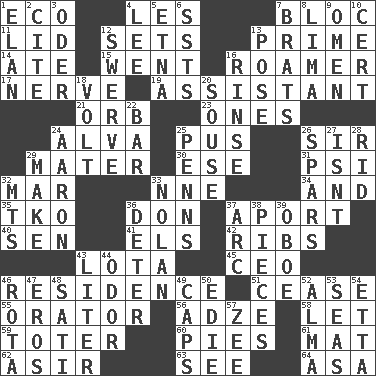 ACROSS 1. Environmental prefix 4. French article 7. Coalition 11. Hat (slang) 12. Puts into a specified state 13. First class 14. Had dinner 15. Left 16. Nomad 17. Impudent aggressiveness 19. Helper 21. Globe 23. Washington bills 24. Inventor's middle name 25. Festering 26. Title for a knight 29. Mother 30. Compass dir. 31. Air pressure measure (abbr.) 32. Make imperfect 33. Compass dir. 34. Also 35. Ring climax 36. Spanish title 37. To the left, to Queeg 40. Elected rep. 41. Raised railways 42. Chest bones 43. Globular water bottle used in Asia 45. Corporate head (abbr.) 46. Home 51. Stop 55. Speaker 56. Edge tool used to cut and shape wood 58. Allow 59. Carrier 60. Sliced desserts 61. Floor covering 62. SW Saudi Arabia district 63. Observe 64. White ___ sheet DOWN 1. Liveliness 2. Quote 3. River in Europe 4. Area sheltered from the wind 5. Inactive volcano in Sicily 6. Fast planes 7. Naughty children 8. Pale green bean 9. Sign of something about to happen 10. An absolute certainty 12. Turn aside suddenly 13. Airs 16. Remove soap 18. Electrical Unit 20. Lush 22. Tavern 24. Composer Copland 25. Actor Sean's family 26. Practice fights 27. Is not 28. To free from 29. Create 32. Mountains (abbr.) 33. Pitcher Ryan 36. Prevent from occurring 37. Curve 38. Components 39. Mitch Miller's instrument 43. 61 cubic inches 44. Scent 46. Round or rotation of duties 47. Greek god of love 48. Suttee (variant) 49. Smile enhancers 50. Singer Brickell 52. _ mater 53. Oceans 54. Singer James 57. Last letter of the English alphabet
