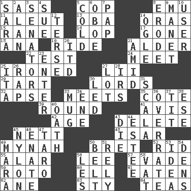 ACROSS 1. Backtalk 5. Police officer (slang) 8. Australian flightless bird 11. Eskimo relative 13. Chief or king in Benin or Nigeria 14. Mouths or openings 15. Indian princess (variant) 16. Chop off 17. Went 18. Santa ___, CA 19. Travel on an animal 21. Tree or shrub in the Birch family 22. Trial 24. Rendezvous 25. Pressed 27. Cards in a Roman deck? 29. Small pie 30. Titled peers of a realm 32. Domed church section 33. Confronts 35. ____ d'Azur (French Riviera) 39. Single shot of ammunition 41. Deliberation 42. Ripen 43. Erase 45. Remaining after all deductions 48. Austrian river, tributary to the Danube 49. Non-adult bird? 50. Cy Young winner Saberhagen 52. To free from 55. Having or resembling wings 56. Area sheltered from the wind 57. Elude 59. Printing process, for short 60. Pipe bend 61. Eroded 62. A saturated hydrocarbon 63. Filthy place 64. Afternoon social gatherings DOWN 1. "Two Mules for Sister ____" 2. ____ Jay Lerner 3. Legislators 4. Institute legal proceedings 5. Having a low temperature 6. Mitch Miller's instrument 7. Infant food 8. Eat (away) 9. French painter Edouard 10. One who makes use of a thing 12. Laconic 14. Stare at amorously 20. It would 21. Among 23. Keyboard key 25. Call ___ day 26. Reproach for some lapse or misdeed 27. Car dealer's back yard 28. Big collection agency 30. Directed 31. Any of the three canals of the cochlea 33. Large cup 34. Compass dir. 36. Make much ado about nothing 37. Teat (slang) 38. Compass dir. 40. Pledge 43. Expire 44. First name in cosmetics 45. High-strength synthetic material 46. Maternal 47. Edible starchy tuberous root 49. Hindu Mythology: god of death 50. Waist strap 51. Depend 53. It may be bright or harebrained 54. Habitations of wild animals 56. French article 58. Large container