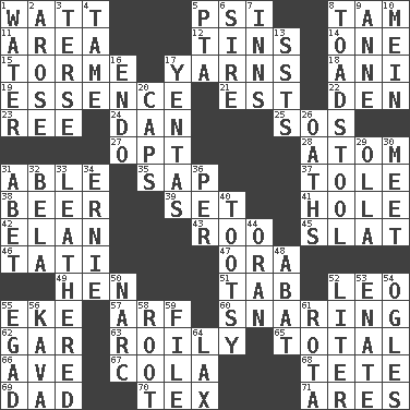 ACROSS 1. Electrical Unit 5. Air pressure measure (abbr.) 8. Scottish cap 11. Type of rug 12. Metal containers 14. Single 15. Singer Mel 17. Entertaining tales 18. Cuckoo 19. Core 21. Eastern Standard Time (abbr.) 22. Lair 23. To riddle 24. One of the 12 tribes of Israel 25. Distress signal 27. Elect 28. Smallest unit of an element 31. Competent 35. Plant excrement 37. Lacquered or enameled metalware 38. Fermented drink made from hops 39. Put into a specified state 41. Hollow 42. Liveliness 43. Friend of Pooh 45. Narrow board 46. Jacques of French films 47. Mouth or opening 49. Layer 51. Bar bill 52. Lion 55. Supplement with great effort 57. Sandy's bark 60. Catching in a trap 62. Slender fish 63. Agitated, as a liquid 65. "_____ Recall" 66. "___ Maria" 67. Root beer relative 68. False hair 69. Male parent 70. John Ritter's dad 71. Ancient Greek god of war DOWN 1. Wetness 2. Came up 3. Laconic 4. Docile 5. Parent Teacher Assoc. 6. Father 7. Taverns 8. Inedible or poisonous agaric 9. Queen of England 1702-14 10. Chow _ 13. Fast planes 16. Inside; within (prefix) 17. Gossips 20. Smile enhancers 26. Expletives 29. Water jar 30. Rendezvous 31. Collude with 32. Actor Lugosi 33. Resembling or made to resemble leather 34. Bert's buddy 36. For each 40. A girl or young woman (variant) 44. Northwest Algerian city 48. Blind as ____ 50. Drug cop 52. 61 cubic inches 53. Maternal 54. Stares at amorously 55. Mild oath 56. Polynesian shrub of the pepper family 58. Carrot, for example 59. Do some clerical work 61. Round or rotation of duties 64. Not strict