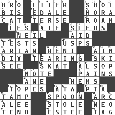 ACROSS 1. Sis' sibling 4. 61 cubic inches 9. Attempt 13. Twice 14. Peak District village in England 15. Israeli folk dance 16. Feline 17. Laconic 18. Wander aimlessly 19. French article 21. Had dinner 22. Bobsleighs 24. Famous astronaut Armstrong 26. Help 27. Trials 29. United States Postal Service (abbr.) 30. Believer in; advocate of (suffix) 31. Painter Guido (1575-1642) 33. The 18th letter of the Arabic alphabet 36. HTML Container Element 37. Rending 40. What Jean-Claude Killy likes to do 41. Observe 42. Three-handed card game 43. Columnist Joseph or Stewart 45. Make mention of 47. Aches 48. One (Scot) 49. Cloth borders 50. Drinks excessively 52. _ moment's notice (2 wds.) 54. Parent Teacher Association (abbr.) 56. Pack (down) 57. Soup utensil 59. Curve 61. Toward shelter 62. Fur scarf 63. Modern: prefix 64. Look after 65. First name in cosmetics 66. Label DOWN 1. English channel? 2. Monetary unit of Yemen 3. Clearly or manifestly demonstrative 4. Allow 5. Perfect 6. Small pie 7. Otherwise 8. To riddle 9. Tears up 10. Parka part 11. Mouths or openings 12. Scottish cap 20. Bristle 22. Indian antelope 23. Mouth edge 25. Is not 27. Small amounts or degrees 28. One of the Great Lakes 29. A single undivided whole 31. Libertine 32. Epoch 33. Aide 34. Picture 35. Cuts off 38. _____ Park, CO 39. Stare wonderingly 44. Desk light 45. Slept 46. Single 49. White Person, in Hawaii 50. Falsehood 51. Sign of things to come 52. Flats, for short 53. A blast of a horn 55. Length times width 56. Make lace 57. Compass dir. 58. Born 60. Gear tooth