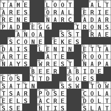 ACROSS 1. Not wild 5. Plunder 9. Keyboard modifier key 12. Ancient Greek god of war 13. Spoken 14. 4th largest of the Great Lakes 15. French philosopher Descartes 16. Drug cop 17. The sixth month of the Jewish calendar 18. Writing tablet 19. Oval reproductive body of a fowl 21. Metal shackles 22. Small Philippine buffalo 24. Fast jet (abbr.) 26. Actress Charlotte 27. Biscuitlike quick bread 28. Makes supply last 29. Raised platform 30. Soviet premier 1918-24 32. Singer James 36. Johnson of "Laugh-In" 37. Had dinner 38. Carrot, for example 39. Negative votes 40. Obtain by seizing forcibly or violently 42. California wine valley 43. Fermented drink made from hops 44. Tolerate 46. Greek goddess of the dawn 49. It would 50. Moves 51. Smooth fabric 53. Compass dir. 54. Pull behind 57. Russian ruler of old 58. Airs 61. Root beer relative 62. Snakelike fish 63. 1/640 square mile 64. Stupid person 65. Compass dir. 66. Nuclear Threat Initiatives 67. Narrow board DOWN 1. Canvas cover 2. Length times width 3. Ananias' fault 4. Compass dir. 5. Protracted 6. Mouth or opening 7. Boat paddle 8. Affectionate concern, for short 9. Zeal 10. Woody, climbing, usually tropical plant 11. Laconic 14. Ewer handle 19. A really long time 20. Highlander 21. It is 23. Olfactory organs 24. Atmospheres 25. Elected rep. 27. "Two Mules for Sister ____" 28. Keyboard key 29. One of the 12 tribes of Israel 31. Having ears or earlike features 32. Bert's buddy 33. Inedible or poisonous agaric 34. Drink excessively 35. _ moment's notice (2 wds.) 40. Dripping 41. Labels 43. Storage container 45. Arrow shooter 46. _____ Park, CO 47. Fertile tracts in a desert 48. Lacking originality or spontaneity 52. Big collection agency 53. Observes 55. Spanish pot 56. Electrical Unit 58. Baking dish 59. Sep. follower 60. Indian title of respect (Mr.) 61. Music discs