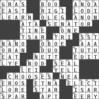 ACROSS 1. Pate de foie ____ 5. Oct. 31 cry 8. Small Philippine buffalo 12. Compass direction 13. Swiss mountan, "Queen of the Mountains" 15. Farming town in central California 16. Memorize 18. Cassini of fashion 19. At once, immediately (arch.) 20. _ moment's notice (2 wds.) 22. Legislator 24. Prong on a fork 26. Single 27. Russian ruler of old 28. Three (prefix) 29. Fast jet (abbr.) 32. Billionth: prefix 35. Mitch Miller's instrument 37. American Automobile Association (abbr.) 38. NW Algerian seaport 39. Superhero pair 40. Ballerina skirt 41. Ingest 42. Remaining after all deductions 43. Prepare for publication 44. Potassium hydroxide 45. Dreamland 46. Lick closed 49. Flowery wreath 50. Shout 51. Elects 55. Teachers' org. 56. Greek god of love 57. Inactive volcano in Sicily 59. Opt 63. Old wives' tales, e.g. 64. Play the lead 65. Austrian river, tributary to the Danube 66. Practice fight 67. Fitting 68. Suggestive of the supernatural DOWN 1. Set 2. Actress Charlotte 3. White ___ sheet 4. Ski resort town in Vermont 5. Sis' sibling 6. Petroleums 7. Double curve, resembling the letter S 8. Having winglike extensions 9. Words to Nanette 10. Scent 11. The 18th letter of the Arabic alphabet 14. Fail to notice 17. Nuclear Threat Initiatives 21. Santa ___, CA 23. Cuckoo 25. Worn away 28. Tootsie (variant) 29. Saudi Arabian king (1953-1964) 30. Suttee (variant) 31. Strained 32. Christmas carol 33. Like ___ of sunshine 34. Nathan's nickname 36. With the exception that 40. Copy Pinocchio 42. Annoying sounds 45. Modern: prefix 47. Car or cant ending 48. Toward shelter 49. Failure 51. Riding implement 52. Israeli folk dance 53. Singer James 54. Fastener 56. Raised railways 58. Nonscientific branch of learning 60. Compass dir. 61. 4-wheeled motor vehicle 62. Attempt