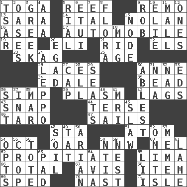 ACROSS 1. Ancient Roman robe 5. Coral collection 9. San ____ (Riviera town) 13. "Two Mules for Sister ____" 14. Slanted text style (abbr.) 15. Pitcher Ryan 16. Toward the sea 17. Car 19. Portuguese money of account (variant) 20. Connecticut Ivy Leaguer 21. To free from 22. Raised railways 23. Heroin 25. Personal question 26. Shoestrings 30. Singer Murray 34. Peak District village in England 35. Necklace unit 36. Simple or foolish person 39. Suffix with ecto or cyto 42. Fails to keep up a pace 43. Fastener 44. Laconic 46. Pacific island yam 47. Moves on water 48. R.R. building 51. Smallest unit of an element 54. Sep. follower 57. Rowing implement 58. Compass dir. 60. Cartoonist voice _ Blanc 62. Conciliate 65. Pale green bean 66. Add up to 67. Opinion 68. Detail 69. Moved rapidly 70. Political cartoonist Thomas 71. Small island DOWN 1. Russian ruler of old 2. Fertile tracts in a desert 3. Hellenic 4. American Automobile Association (abbr.) 5. Monetary unit of Yemen 6. Needle holder 7. Erode 8. Plants 9. Director Reiner 10. Writer Wiesel 11. Shopping center 12. Washington bills 15. Thickened enlargement 18. Russian fighter aircraft 20. Mild oath 24. City in Syria 27. Head covering 28. Pipe bend 29. Theater features 30. Most capable 31. Teachers' org. 32. Tired old horse 33. Begley and Asner 36. Fast jet (abbr.) 37. _ tizzy (2 wds.) 38. Impair 40. Ocean 41. Medical imaging device (abbr.) 45. Cole _ (cabbage dish) 48. Earth 49. Make lace 50. Believer in; advocate of (suffix) 52. Leaves out 53. Klaipeda city 54. Chooses 55. Riding implement 56. Lug 58. Nuclear Threat Initiatives 59. Egg locale 61. Unable to walk 63. Groovy apt. 64. Actress Gardner 65. Cards in a Roman deck?