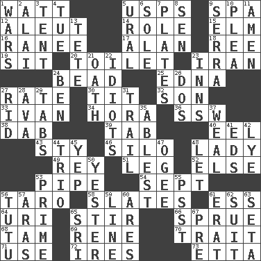 ACROSS 1. Electrical Unit 5. United States Postal Service (abbr.) 9. Health resort 12. Native American of Southwest Alaska 14. Hero or heavy, e.g. 15. Shade tree 16. The wife of a rajah (variant) 17. ____ Jay Lerner 18. To sift 19. Be seated 20. Bathroom 23. SW Asia republic 24. Necklace unit 25. Pulitzer Prize-winning author Ferber 27. Pace 30. Teat (slang) 32. Male child 33. "Terrible" tsar 34. Israeli folk dance 36. Compass dir. 38. Pat or tap gently 39. Bar bill 40. Snakelike fish 43. Filthy place 46. Grain storage tower 48. Kenny Rogers chart-topper in '80 49. Marina Del _, California 51. Part of a journey 52. Otherwise 53. Corncob 54. Back-to-school mo. 56. Pacific island yam 58. Chalkboards 61. Double-curved letter 64. RI univ. 65. Commotion 66. Disorder 68. Scottish cap 69. French philosopher Descartes 70. Distinguishing feature 71. Purpose 72. Angers 73. Singer James DOWN 1. Armed conflicts 2. Jai _ 3. Portable shelter 4. Third day of the wk. 5. Mountain range 6. Not divided or shared with others 7. Food holders 8. Elected rep. 9. Father Junipero _ 10. Entreaty 11. So be it 13. False hair 21. Pledge 22. Foolish or stupid persons 23. Restaurants 24. Benjamin's nick name 26. Two (Sp.) 27. To free from 28. Actress Gardner 29. Bar bills 31. Go after with the intent to catch 35. Most capable 37. Welt 41. Begley and Asner 42. Potassium hydroxide 44. Musical group of three 45. Slangy assent 47. Double curve, resembling the letter S 48. Allow 50. Next before 53. A-one 55. Inconspicuous attention getter 56. Ballerina skirt 57. Caspian sea tributary 59. Actor's bit 60. Ancient Greek god of war 61. Part of Q.E.F. 62. Set of matching outer garments 63. Stalk of a moss capsule 65. _ Lanka 67. Before (prefix)