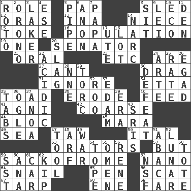 ACROSS 1. Hero or heavy, e.g. 5. Infant food 8. Downhill vehicle 12. Mouths or openings 13. _ tizzy (2 wds.) 14. Sibling's daughter 15. Casino tip 16. Census information 19. Single 20. Elected representative 21. Relating to the mouth 23. And so on (abbr.) 24. "We ___ not amused" (Victoria) 27. Patter 30. To draw with force 31. Refuse to acknowledge 34. Singer James 35. Frog relative 38. Eat (away) 40. Nourish 41. Hindu god of fire 42. Unrefined 44. Coalition 45. Hindu Mythology: god of death 46. Ocean 47. The 23rd letter of the Hebrew alphabet 50. Slanted text style (abbr.) 53. Speakers 57. With the exception that 59. Italian handbag shop? 63. Billionth: prefix 64. Slow-paced one 65. Animal enclosure 66. Jazz singing style 67. Canvas cover 68. Compass dir. 69. Conductor's collection DOWN 1. Printing process, for short 2. U. of Maine site 3. Member of a famous L.A. basketball team 4. Compass dir. 5. Corncob 6. Soon (poet.) 7. Dad 8. Be seated 9. Flowery wreath 10. Environmental prefix 11. Lair 14. Drug cop 17. Shoshoni 18. Car dealer's back yard 20. Volcanic refuse 22. Being or containing an acid 24. Johnson of "Laugh-In" 25. Pace 26. Mild oath 28. Compass dir. 29. Torque (variant) 30. Outscore 32. Friend of Pooh 33. Dutch treat 35. Bar bills 36. Stare 37. Small Philippine buffalo 39. Epoch 43. Indian titles of respect 47. Instrument 48. Sandy's bark 49. Armed conflict 51. Phillipine bananalike plant 52. Type of eclipse 54. Drink excessively 55. Sign of things to come 56. French philosopher Descartes 58. Carryall 59. Fast jet (abbr.) 60. Santa ___, CA 61. Auto 62. Sleep 63. Science/research agcy.