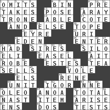 ACROSS 1. Leaves out 6. Storage container 9. Before (prefix) 12. Receives possession of 13. Airs 14. Like ___ of sunshine 15. Heavy duty weighing machine 16. Competent 17. ____ d'Azur (French Riviera) 18. Also 19. Otherwise 20. Drink excessively 21. Jane of fiction 23. RI univ. 24. Locale of original sin 25. Keyboard key 28. Possessed 30. Male parents of animals 34. Grain storage tower 35. Biblical high priest 36. Artist's stand 38. Small island 39. Loose flowing garment 41. _____ Park, CO 43. Afternoon social gathering 44. Exchanges for money 46. Grand slam 48. Raised railways 49. French philosopher Descartes 50. A single undivided whole 51. Russian composer Stravinsky 53. Compass dir. 56. Margarine 57. Small Philippine buffalo 58. "_____ Recall" 60. Political cartoonist Thomas 61. Detail 62. Originate 63. Followers of ems 64. Two (Sp.) 65. Trials DOWN 1. Baseball player Mel 2. Hindu Mythology: god of death 3. Image 4. Watched over 5. Compass dir. 6. Moves up and down 7. Capri or Wright 8. Born 9. Appease 10. Assign a rank or rating to 11. Sight organ 13. Light colored 14. Oak nuts 19. Bert's buddy 20. Third day of the wk. 22. Affirmative reply 24. The property of being fit to eat 26. Writer Wiesel 27. Roll call or roster of names 28. Possessive pronoun 29. _ vera 31. Actress Charlotte 32. Double-curved letter 33. Put into a specified state 37. Crowbar 40. American author Paul (1891-1958) 42. Boy, to dad 45. Fast jet (abbr.) 47. Poe poem 49. Wander aimlessly 50. Uhlan (variant) 51. To the inside or interior of 52. Leaves 54. Nuclear Threat Initiatives 55. 90 degrees 56. Single 57. Assist 58. Make lace 59. French article