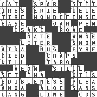 ACROSS 1. Feline 4. Coast Guard woman 8. Proofreading order 12. Angers 14. 4th largest of the Great Lakes 15. Ubangi River tributary 16. Become fatigued 17. Unrelated to defense, as in spending 20. Comfort 21. Rowing implement 22. Animal enclosure 23. 1973 Nobel Price Winner (Physics) Leo 27. Be footloose 29. Nathan's nickname 31. Queen of England 1702-14 34. 61 cubic inches 35. Frozen precipitation 36. Opera by Verdi 39. Java container 41. Jane of fiction 42. Passed on 43. Dice game 46. Deli pickle 47. Pacific island yam 48. A really long time 51. Free of sound 54. Put into a specified state 56. _ tizzy (2 wds.) 58. Lubricates 61. The property of being fit to eat 66. Entreaty 67. Small Philippine buffalo 68. Medicinal plant 69. Without 70. Austrian-born American filmmaker Fritz 71. Actor's bit 72. Music discs DOWN 1. Quote 2. Operatic vocal solo 3. Laconic 4. Elected rep. 5. Adept person 6. The 18th letter of the Arabic alphabet 7. Redecorate 8. Institute legal proceedings 9. 3-inch nail 10. Otherwise 11. Adolescent 13. Observes 18. Ewer handle 19. From 24. Black tropical American cuckoo 25. Krazy ___ of comics 26. A whole individual unit 28. Flower holders 30. Spew [out] 32. Or not 33. She-sheep 34. Dipping utensil 36. Say or write further 37. One more than two 38. Accusation by an informer 40. Pate de foie ____ 44. Tate display 45. Luau course 49. Lubricate 50. Compass dir. 52. Chops off 53. Pale purple color 54. Lick closed 55. Pulitzer Prize-winning author Ferber 57. Of or related to the anus 59. Grant temporary use of 60. Backtalk 62. Paper or plastic container 63. Connecticut Ivy Leaguer 64. Boy, to dad 65. Perceive with the eye