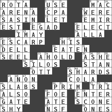 ACROSS 1. Round or rotation of duties 5. Purpose 8. Big _ 11. Sports stadium 13. Numbers guy (abbr.) 14. Past tense of be (plural) 15. Indian antelope 16. Allow 17. Independent ruler or chieftain 18. Eastern Standard Time (abbr.) 19. Mild oath 21. Opt 22. "If ____ say so..." 24. Silent film actress Nazimova 25. Fortification 27. Part of HMS, perhaps 29. Small valley 30. Consumed 32. Stitch closed the eyes of (a falcon) 33. Hold, grip (Informal) 35. American tennis player Robert 39. Grain storage towers 41. Comedian Laurel of Laurel & Hardy 42. Baseball player Mel 43. Broken pieces 45. At once, immediately (arch.) 48. Root beer relative 49. Broad, flat, thick pieces 50. Demure 52. Three (prefix) 55. In addition 56. Enemy 57. Keyboard key 59. Yard entry 60. Had dinner 61. Biscuitlike quick bread 62. Like a shrinking violet 63. Science/research agcy. 64. Washington bills DOWN 1. Raze (variant) 2. Mouths or openings 3. One of the two male reproductive glands 4. Cuckoo 5. Southern CA. univ. 6. Moved rapidly 7. Ingest 8. Klaipeda city 9. N. Chile seaport 10. Foregone conclusion 12. Approach 14. Not ill 20. Hustle 21. Relaxation 23. Promenades 25. Begley and Asner 26. Perceive with the eye 27. Actor Linden 28. It would 30. Greek goddess of the dawn 31. Rhinal 33. Keyboard modifier key 34. Being at a high temperature 36. Ski resort town in Vermont 37. Possessed 38. Followers of ems 40. Charged atoms 43. _-fi 44. Dwellings 45. Assad's deity 46. Offensive 47. Mitch Miller's instrument 49. Sinks 50. Plant holders 51. Coral collection 53. French philosopher Descartes 54. Angers 56. Air blower 58. Non-commissioned officer (abbr.)