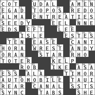 ACROSS 1. Small bed 4. Allodial 8. So be it 12. Mild oath 14. Literary convention 16. Make new 17. _ mater 18. Pleas 20. Sleazy 22. Snakelike fish 23. Compass dir. 24. Begley and Asner 25. Lizard (obsolete) 28. Area sheltered from the wind 30. Small island 31. _____ Park, CO 35. Nine, plus one 37. Relaxation 40. Patter 41. Israeli folk dance 42. Take or capture by force 44. "60 Minutes" Commentator Rooney 45. Northwest Algerian city 46. Play the lead 47. 17th letter of the Greek alphabet 48. Carrier 50. Seaweed 52. Director Reiner 54. Mamie's mate 55. White ___ sheet 58. Curvy letter 61. According to 63. The easternmost of the Lesser Sundas 65. Form of transportation 70. "Change" in Tahitian 71. Posterior 72. Lessep's creation 73. Fast planes 74. Synchronize (abbr.) 75. Bar bills 76. A female animal or person DOWN 1. Desist 2. Stared at amorously 3. Makes less strong or intense 4. Shoshoni 5. Spanish title 6. Fitting 7. Old wives' tales, e.g. 8. Tate display 9. Count _ (2 wds.) 10. Genesis locale 11. Olfactory organ 13. Male parent 15. Sew up the eyelids of hawks and falcons 19. Toward shelter 21. Affirmative reply 26. Soared 27. Rends 29. Fortification 30. More lacking in sense or substance 32. Hyperbolic tangent 33. Inside; within (prefix) 34. Filthy place 35. "Corrida" creature 36. Part of Q.E.F. 38. Put into a specified state 39. 1973 Nobel Price Winner (Physics) Leo 41. Being at a high temperature 43. Long journey 49. Wander aimlessly 51. Allow 53. Group of countries in special alliance 55. Collect or gather 56. Compass direction 57. Get up 58. Hearing organs 59. Chop _ 60. Comedian Laurel of Laurel & Hardy 62. Blind as ____ 64. It is 66. The grampus (Milton) 67. _ tizzy (2 wds.) 68. Experiment locale 69. Raised railways