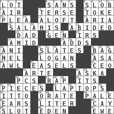ACROSS 1. Car dealer's back yard 4. Without 8. Oscar Madison type 12. Wind 13. Laconic 14. Puff or smoke 15. Entreaty 17. Upward 18. Roberta Peters solo 19. Deli grouping 21. Stayed 23. June honoree 24. Commissioned mil. rank 26. Big collection agency 27. Among 28. Does sums 30. Black tropical American cuckoo 31. Chalkboards 34. Paper or plastic container 37. Cartoonist voice _ Blanc 38. Utah city north of Ogden 39. White ___ sheet 40. Leather borer 41. Artist's stands 42. Corporate head (abbr.) 43. Johnson of "Laugh-In" 44. "____ silly question..." 46. Personal Computers (abbr.) 47. Hit sharply and swiftly 50. It is 51. Parts 54. Portable computers 57. "Tell ____ the Marines!" 58. Declaim 60. Diluted with white 62. Hearing organs 63. 61 cubic inches 64. Island 65. Narrow, elongated depression 66. Locale of original sin 67. She-sheep DOWN 1. Pet locale 2. Lubricates 3. Excercise machine 4. Former Milwaukee Brewers owner Bud 5. Came up 6. Overdraft (abbr.) 7. Bristle 8. Flight of steps 9. Titled peers of a realm 10. Migrant worker of the '30s 11. Necklace unit 13. Scottish cap 16. Mountain range southwest of Kyrgyzstan 20. Say or write further 22. Auction offers 25. Relating to or accompanying birth 27. Afresh 29. Habitations of wild animals 30. Nanny (var.) 31. Narrow board 32. Failure 33. Mature 34. Keyboard key 35. Toward the sea 36. E Mali city 41. Celtic language 43. Buttonhole 44. Small island 45. Halt 46. Stone: prefix 48. Having winglike extensions 49. Eucharist need 51. Sliced desserts 52. Slanted text style (abbr.) 53. Not divided or shared with others 55. For each 56. Cole _ (cabbage dish) 59. To free from 61. Sight organ