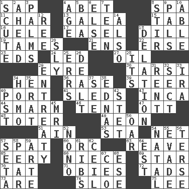 ACROSS 1. Plant excrement 4. Collude with 8. Health resort 11. Burn to charcoal 13. An organ shaped like a helmet 15. Keyboard key 16. Ubangi River tributary 17. Artist's stand 18. Deli pickle 19. Corrects by punishment or discipline 21. Followers of ems 22. Celtic language 23. Begley and Asner 24. Directed 27. Lubricate 29. Jane of fiction 30. Tarsus (plural) 34. Layer 36. To erase 39. Bull 40. Sweet dark-red dessert wine 41. Bobsleighs 43. South American Indian 44. Excessive but superficial compliments 46. Portable shelter 47. Baseball player Mel 48. Carrier 49. A really long time 51. The 18th letter of the Arabic alphabet 53. R.R. building 54. Fish or hair follower 57. Argument over a trivial matter 60. The grampus (Milton) 63. Break or tear apart 65. Suggestive of the supernatural 66. Sibling's daughter 69. Play the lead 70. Make lace 71. Off-Broadway awards 72. Small amounts or degrees 73. "We ___ not amused" (Victoria) 74. _ gin 75. Area sheltered from the wind DOWN 1. Snake scale 2. At or in the front 3. Insides of hands 4. Grow older 5. Sound made by sheep 6. Otherwise 7. Adolescent 8. Agitate 9. Friends 10. Competent 12. To sift 14. In addition 18. Conveyance 20. Roguish 25. Blunders 26. Started a card game 28. ___ a Wonderful Life 29. Plea 31. Monthly bill 32. Religious group 33. Retirement account (abbr.) 34. Same (prefix) 35. Part of Q.E.F. 37. Observe 38. Ferber et al. 40. Pacific Standard Time (abbr.) 42. Proofreading order 45. Medical imaging device (abbr.) 50. Rowing implement 52. Words to Nanette 54. Relating to or accompanying birth 55. Dodge 56. Laconic 57. Stalk of a moss capsule 58. Lightbulb-shaped fruit 59. Johnson of "Laugh-In" 61. Teases 62. To provide with a ceiling 64. Eastern Standard Time (abbr.) 67. Corporate head (abbr.) 68. Compass dir.