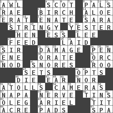 ACROSS 1. Leather borer 4. Native of Scotland 8. Friends 12. Actress Charlotte 13. A tree used for making furniture 14. Medicinal plant 15. Part of Q.E.F. 17. Related on the mother's side 18. "Two Mules for Sister ____" 19. Slender, wiry 21. Last past 23. Layer 24. Curvy letter 26. Area sheltered from the wind 27. Nourish 28. Put down 30. Title for a knight 31. Break 34. Animal enclosure 37. Compass dir. 38. Declaim 39. The grampus (Milton) 40. Dreamland 41. Sounds asleep 42. Friend of Pooh 43. Puts into a specified state 44. Chooses 46. Pass on 47. Hearing organ 50. And not 51. Ringlike coral islands and reefs 54. Devices for capturing images 57. California wine valley 58. Effrontery 60. Metal containers 62. Cassini of fashion 63. Satellite of Uranus 64. Teat (slang) 65. 1/640 square mile 66. Writing tablets 67. Health resort DOWN 1. "We ___ not amused" (Victoria) 2. Armed conflicts 3. Tough but pliablecoriaceous 4. Scorch 5. Trading vessels 6. Sep. follower 7. Those things 8. Went by 9. Having winglike extensions 10. Old wives' tales, e.g. 11. Singe 13. Benjamin's nick name 16. Family _ (genealogy) 20. Working for oneself (abbr.) 22. Writer Wiesel 25. Chalkboard 27. Fine (Spanish) 29. Matures 30. Elected rep. 31. Do not 32. Came up 33. Make imperfect 34. Likenesses of persons 35. Greek god of love 36. Non-commissioned officer (abbr.) 41. Stitch closed the eyes of (a falcon) 43. Fodder prepared in a silo 44. Single 45. Left side of a ship or aircraft 46. Drug addict 48. Bitter 49. All-night dance parties 51. Small Philippine buffalo 52. Baby powder 53. Fastener 55. Cartoonist voice _ Blanc 56. Clip 59. Period 61. R.R. building