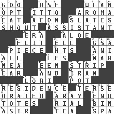 ACROSS 1. Thick or sticky substance 4. Purpose 7. Uhlan (variant) 11. Elect 12. "Tell ____ the Marines!" 13. Odor 14. Consume 15. A really long time 16. Chalkboards 17. Yell 19. Aide 21. Epoch 23. _ vera 24. Sudden quick movement 25. Pipe bend 26. Girls' org. (abbr.) 29. Component 30. Mountains (abbr.) 31. Cuckoo 32. Everything 33. French article 34. Spoil 35. Teachers' org. 36. Car or cant ending 37. Long narrow piece of something 40. Hearing organ 41. Plus 42. SW Asia republic 43. Australian parrot (variant) 45. Cooking vessel 46. Dwelling 51. Laconic 55. Declaimed 56. Like ___ of sunshine 58. Conclusion 59. Hauls 60. Monetary unit of Yemen 61. Storage container 62. SW Saudi Arabia district 63. Beverage made from leaves 64. Health resort DOWN 1. Leaves 2. Brightly colored fish 3. "Beetle Bailey" pooch 4. Shoshoni 5. Portico 6. Immeasurably long periods of time 7. A salt of uric acid 8. Globular water bottle used in Asia 9. So be it 10. Political cartoonist Thomas 12. Of or pertaining to medicine 13. In addition 16. Beverly of Met fame 18. Ubangi River tributary 20. Table seasonings 22. Had dinner 24. Having threads 25. Make improvements or corrections to 26. Homeless child 27. Fastener 28. Atmosphere 29. Entreaty 32. A saturated hydrocarbon 33. Soviet premier 1918-24 36. Having ears or earlike features 37. Small drink 38. TNT 39. Pace 43. 61 cubic inches 44. Lyric poems 46. Roll call or roster of names 47. Greek god of love 48. Suttee (variant) 49. Haul 50. 4th largest of the Great Lakes 52. Confederate soldiers (slang) 53. Sever or remove by pinching or nipping 54. Pulitzer Prize-winning author Ferber 57. American Automobile Association (abbr.)