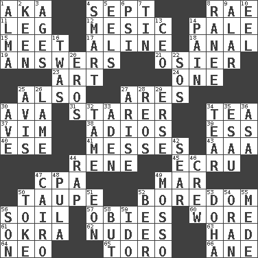 ACROSS 1. Alias (abbr.) 4. Back-to-school mo. 8. Actress Charlotte 11. Part of a journey 12. Mesonic 14. Diluted with white 15. Rendezvous 17. Place in a line 18. Of or related to the anus 19. Responds (to) 21. Flexible twig of a willow tree 23. Tate display 24. Single 25. In addition 27. Ancient Greek god of war 30. Actress Gardner 31. A viewer who gazes fixedly 34. Beverage made from leaves 37. Zeal 38. Goodbye (Sp.) 39. Curvy letter 40. Compass dir. 41. Makes clutter 43. Auto club (abbr.) 44. French philosopher Descartes 45. Shade of tan 47. Accounting whiz (abbr.) 49. Third mo. 50. Grayish beige 52. Mood resulting from idleness 56. The visible part of the earth's surface 57. Off-Broadway awards 60. Had on 61. Gumbo ingredient 62. Unadorned figures 63. Possessed 64. Modern: prefix 65. "Corrida" creature 66. One (Scot) DOWN 1. _ mater 2. Peachy ____! 3. Grows older 4. Don Adams' spy role 5. Snakelike fish 6. Air pressure measure (abbr.) 7. Shallow baking pan 8. Indian princess (variant) 9. Having or resembling wings 10. Snakelike fish 13. Corporate head (abbr.) 14. Ache 16. It was, poetically 20. Greek god of love 22. Distress signal 25. Opinion 26. Unable to walk 27. Get up 28. Vintage cars 29. Celtic language 30. "___ Maria" 32. Not wild 33. An important port of Yemen 34. Separate forcefully 35. Son of Isaac 36. White ___ sheet 42. Shrivel 44. Strike 46. Ship's personnel 47. Capital of Egypt 48. Monetary unit of Botswana 49. With motion or animation 50. Casino tip 51. Age 52. Fermented drink made from hops 53. Capital of the state of Qatar 54. Northwest Algerian city 55. Ancient Persian 56. Boy, to dad 58. On the contrary 59. Wedding promise
