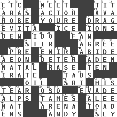 ACROSS 1. And so on (abbr.) 4. Confront 8. Teat (slang) 11. Ancient river in northeast Turkey 13. Thespian 15. Actress Gardner 16. Loose flowing garment 17. You are 18. To trail on the ground 19. Webber/Rice musical 21. Frozen water 22. Charged particles 23. Lair 24. Wedding promise 27. Avid follower 29. Agitate 30. Match 34. Before (prefix) 36. Arab leader 39. Stay 40. Age 41. Prevent from occurring 43. An important port of Yemen 44. Brizilian seaport 46. To erase 47. Nine, plus one 48. Feeling or showing extreme anger 49. Small boys 51. Petroleum 53. _ Lanka 54. Part of HMS, perhaps 57. Pull into pieces 60. Bear (Spanish) 63. Elude 65. High mountains 66. Domesticates 69. Toward shelter 70. Floor protector 71. Sports stadium 72. Frog relative 73. Followers of ems 74. "60 Minutes" Commentator Rooney 75. Mischievous DOWN 1. Having ears or earlike features 2. Collection of objects 3. Apartment or room in a ship 4. Can I? 5. Environmental prefix 6. Needle holder 7. Torque (variant) 8. Edible starchy tuberous root 9. _ the terrible 10. Labels 12. Put into a specified state 14. Coral ridge 18. Empty-headed or silly people 20. Small island 25. Passed on 26. Channel Islands abalone 28. American Automobile Association (abbr.) 29. Elected representatives 31. Travel on or in a vehicle 32. Locale of original sin 33. Car or cant ending 34. Lightbulb-shaped fruit 35. Round or rotation of duties 37. Call ___ day 38. Musical pauses 40. Black tropical American cuckoo 42. Bring up, as a child 45. Luau accessory 50. Pass on 52. Globular water bottle used in Asia 54. Auras 55. Standard of perfection 56. Sleazy 57. Not wild 58. Style 59. Tenement units (abbr.) 61. "Two Mules for Sister ____" 62. Sign of things to come 64. Large container 67. Conclude 68. Declare
