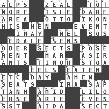 ACROSS 1. High mountains 5. Ardor 9. Small child 12. Greater amount 13. Small island 14. Have the gumption 15. Type of rug 16. Von Bismarck 17. Image 18. Part of HMS, perhaps 19. Layer 21. Happening 22. "If ____ say so..." 24. Cartoonist voice _ Blanc 26. Mayday 27. Peak District village in England 28. Elected reps. 29. Baltic tributary 30. Religious groups 32. Introduce or present, as a question 36. Monthly bill 37. Third mo. 38. SW Saudi Arabia district 39. Pismires 40. The easternmost of the Lesser Sundas 42. Portico 43. Snakelike fish 44. Consumed 46. And so on (abbr.) 49. 24 hours 50. So be it 51. Theater features 53. Retirement account (abbr.) 54. Plant excrement 57. Hyperbolic tangent 58. Among 61. _ and Stitch 62. Celtic language 63. Johnson of "Laugh-In" 64. Nights before holidays 65. Fast jet (abbr.) 66. Opera by Verdi 67. Religious group DOWN 1. Nanny 2. Australian parrot (variant) 3. Elected leader of a country 4. Ocean 5. The Jewish people; Israel 6. Eastern Standard Time (abbr.) 7. The first octave above the treble staff 8. Lion 9. Proceeds 10. U. of Maine site 11. Portable shelters 14. HTML Container Element 19. Actor Linden 20. Snake ____ (dice throw) 21. Raised railways 23. Shops 24. Paris' subway 25. Followers of ems 27. Paradise 28. Fraudulent business schemes 29. Mouth or opening 31. Poet Dickinson 32. Thick mixture 33. Clearly or manifestly demonstrative 34. The Jewish people; Israel 35. Period 40. Beverage made from leaves 41. Tail end 43. Begley and Asner 45. Nursemaid (var.) 46. _____ Park, CO 47. Pulls apart 48. 2nd pers. sing. pres. of can (arch.) 52. Definite Article 53. The content of cognition 55. Actor Baldwin 56. Mail 58. American Automobile Association (abbr.) 59. Medical imaging device (abbr.) 60. It would 61. French article