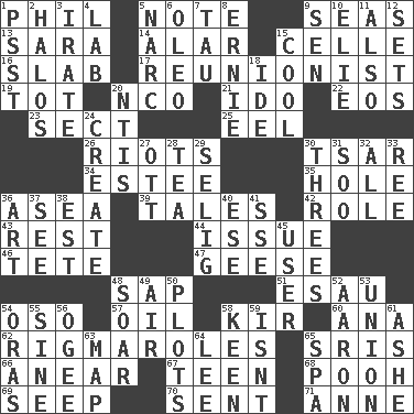 ACROSS 1. Silvers or Donahue 5. Short letter 9. Oceans 13. "Two Mules for Sister ____" 14. Having or resembling wings 15. Cell (Danish) 16. Broad, flat, thick piece 17. One who advocates reunion 19. Small child 20. Non-commissioned officer (abbr.) 21. Wedding promise 22. Greek goddess of the dawn 23. Religious group 25. Snakelike fish 26. Disturbances 30. Russian ruler of old 34. First name in cosmetics 35. Opening into or through something 36. At sea 39. Lies 42. Hero or heavy, e.g. 43. Repose 44. Come out of 46. Wig 47. Honkers 48. Plant excrement 51. Son of Isaac 54. Bear (Spanish) 57. Lubricate 58. Apertif with cassis 60. Santa ___, CA 62. Frustrating wastes of time 65. Indian titles of respect 66. Approach 67. Adolescent 68. "Silly old bear" 69. Ooze 70. Emitted 71. Queen of England 1702-14 DOWN 1. Inconspicuous attention getter 2. Auras 3. Feeling or showing extreme anger 4. Experiment locale 5. Drug cop 6. Margarine 7. The 19th letter of the Greek alphabet 8. Bert's buddy 9. Elected rep. 10. Writer Wiesel 11. In addition 12. Arranges properly for use 15. Calm and collected 18. Binary compound 20. Nuclear Threat Initiatives 24. Cause to be 27. Baseball player Mel 28. Beverage made from leaves 29. Major League Baseball Commissioner Bud 30. Triads 31. "Barney Miller" actor Jack 32. Everything 33. Portuguese money of account (variant) 36. Nonscientific branch of learning 37. Perceive with the eye 38. Eastern Standard Time (abbr.) 40. Compass dir. 41. Compass dir. 45. One who uses or employs something 48. Fly high 49. Wind 50. Secret plans 52. Composer Copland 53. The state of being joined or united 54. Mouths or openings 55. Trig term 56. Double curve, resembling the letter S 58. Peachy ____! 59. Is not 61. American tennis player Robert 63. Atlas unit 64. Area sheltered from the wind 65. Health resort