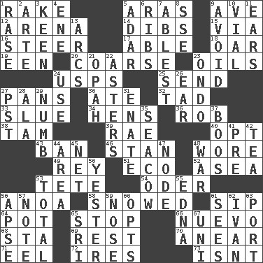 ACROSS 1. Immoral or dissolute person 5. Caspian sea tributary 9. "___ Maria" 12. Sports stadium 14. Rights 15. By way of 16. Bull 17. Competent 18. Rowing implement 19. Car or cant ending 20. Rough 23. Petroleums 24. United States Postal Service (abbr.) 25. Post 27. Zero-star reviews 30. Had dinner 32. Bit 33. Turn sharply 34. Coop moms 36. Director Reiner 38. Scottish cap 39. Actress Charlotte 40. Choose 43. Prohibit 46. Comedian Laurel of Laurel & Hardy 48. Had on 49. Marina Del _, California 51. Environmental prefix 52. Toward the sea 53. False hair 54. Baltic tributary 56. Small Philippine buffalo 58. Frozen precipiation fell 61. Small drink 64. Plant holder 65. Cease 66. New (sp.) 68. R.R. building 69. State of inaction 70. Approach 71. Snakelike fish 72. Angers 73. Is not DOWN 1. To erase 2. Johnson of "Laugh-In" 3. Peachy ____! 4. Compass dir. 5. The sixth month of the Jewish calendar 6. Teases 7. Most capable 8. Compass dir. 9. Shun 10. Small bottle 11. Hearing organs 13. Arches 21. Brightly colored fish 22. Michaelmas daisies 23. Southwest Nigerian state 24. Purpose 26. Hearing organ 27. Pacific Standard Time (abbr.) 28. In the manner of 29. Unfeeling 31. Related on the mother's side 35. Manatee 37. Scornful sounds 41. Before (prefix) 42. Afternoon social gathering 44. Type of rug 45. Fish or hair follower 47. Thickened enlargement 48. Armed conflict 50. Last 53. "_____ Recall" 55. Pulitzer Prize-winning author Ferber 56. Domed church section 57. Short letter 59. Sense of smell 60. Chooses 61. Perceives with the eye 62. _ the terrible 63. Left side of a ship or aircraft 65. _ Lanka 67. Single; one (prefix)