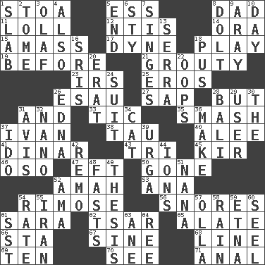 ACROSS 1. Portico 5. Curvy letter 8. Male parent 11. Hang loosely or laxly 12. Nuclear Threat Initiatives 14. Mouth or opening 15. Collect or gather 17. Centimeter-gram-second unit of force 18. Live dramatic performance 19. Prior to 21. Cross 23. Big collection agency 25. Greek god of love 26. Son of Isaac 27. Plant excrement 28. On the contrary 31. Plus 33. Nervous spasm 35. Box-office sellout 37. "Terrible" tsar 38. The 19th letter of the Greek alphabet 40. Toward shelter 41. Middle Eastern gold or silver currency 43. Three (prefix) 45. Apertif with cassis 46. Bear (Spanish) 47. Lizard (obsolete) 50. Went 52. Wet nurse 53. Santa ___, CA 54. Full of chinks, cracks, or crevices 56. Sounds asleep 61. "Two Mules for Sister ____" 62. Russian ruler of old 65. Having winglike extensions 66. R.R. building 67. Trig term 68. Actor's bit 69. Nine, plus one 70. Perceive with the eye 71. Of or related to the anus DOWN 1. Broad, flat, thick piece 2. Heavy book 3. Norwegian king 4. In addition 5. Conclusion 6. Filthy place 7. Burns superficially 8. Dunce 9. Like ___ of sunshine 10. 24 hours 13. Father Junipero _ 16. Indian titles of respect 18. Festering 20. Part of Q.E.F. 22. I made a mistake 24. Set of matching outer garments 26. Pulitzer Prize-winning author Ferber 28. Indonesian resort city 29. One who makes use of a thing 30. Definite Article 31. Deliberation 32. Billionth: prefix 34. Domesticated feline 36. Create 37. Wedding promise 39. Capital and largest city of Mongolia 42. San ____ (Riviera town) 44. Charged particles 48. Goes without food and/or water 49. College paper 51. Nanny 52. Nanny (var.) 54. Assign a rank or rating to 55. SW Asia republic 57. Spanish pot 58. Water falling in drops from the sky 59. Inactive volcano in Sicily 60. Stitch closed the eyes of (a falcon) 61. Fast jet (abbr.) 63. A saturated hydrocarbon 64. To separate or throw off