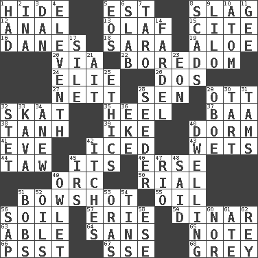 ACROSS 1. Flintstone garb 5. Eastern Standard Time (abbr.) 8. Volcanic refuse 12. Of or related to the anus 13. Norwegian king 15. Quote 16. Natives or inhabitants of Denmark 18. "Two Mules for Sister ____" 19. _ vera 20. By way of 22. Mood resulting from idleness 24. Writer Wiesel 26. Two (Sp.) 27. Remaining after all deductions 28. Elected rep. 29. Baseball player Mel 32. Three-handed card game 35. Person who is morally reprehensible 37. Sound made by sheep 38. Hyperbolic tangent 39. Eisenhower's nickname 40. Dormintory (informal) 41. First lady 42. On the rocks 43. Moistens 44. The 23rd letter of the Hebrew alphabet 45. ___ a Wonderful Life 46. Celtic language 49. The grampus (Milton) 50. Monetary unit of Yemen 51. The distance a bow sends an arrow 55. Lubricate 56. The visible part of the earth's surface 57. One of the Great Lakes 59. Middle Eastern gold or silver currency 63. Competent 64. Without 65. Observe 66. Inconspicuous attention getter 67. Compass dir. 68. Jennifer or Joel DOWN 1. Possessed 2. _ tizzy (2 wds.) 3. One of the 12 tribes of Israel 4. Veterans Day date 5. Greek goddess of the dawn 6. Broad, flat, thick piece 7. Edible starchy tuberous root 8. Loads 9. _ and Stitch 10. Tiny particle 11. Unit of force equal to gravity 14. Burden 17. Filth; sediment 21. Small island 23. Age 25. Moral principles 28. Sowing specialist 29. Mitch Miller's instrument 30. Small pie 31. Scottish caps 32. Proofreading order 33. Polynesian shrub of the pepper family 34. Afresh 36. Make supply last 40. Residence 42. Irritating cutaneous sensations 45. Big collection agency 47. _ de Janeiro 48. Expressed in words 49. A small or young owl 51. Moves up and down 52. Lubricates 53. Mouths or openings 54. Airtight sealed metal containers 56. Plant excrement 58. Compass dir. 60. And not 61. Had dinner 62. Marina Del _, California