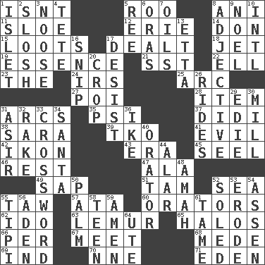 ACROSS 1. Is not 5. Friend of Pooh 8. Cuckoo 11. A type of plum 12. 4th largest of the Great Lakes 14. Spanish title 15. Plunders 17. Started a card game 18. Passenger plane 19. Center 21. Fast jet (abbr.) 22. Pipe bend 23. Definite Article 24. Big collection agency 25. Curve 27. Luau course 28. Detail 31. Curves 35. Air pressure measure (abbr.) 37. "You Light Up My Life" star Conn 38. "Two Mules for Sister ____" 39. Ring climax 41. Tending to cause great harm 42. Picture 43. Period 45. Stitch closed the eyes of (a falcon) 46. Remainder 47. Chicken ___ king 49. Plant excrement 51. Scottish cap 52. Ocean 55. The 23rd letter of the Hebrew alphabet 57. _ moment's notice (2 wds.) 60. Speakers 62. Wedding promise 63. Arboreal primate 65. Saint headwear 66. For each 67. Confront 68. Ancient Persian 69. Working for oneself (abbr.) 70. Compass dir. 71. Paradise DOWN 1. Small island 2. Agitate, as a liquid 3. Trap for birds or small mammals 4. Wig 5. To sift 6. Mouths or openings 7. Petroleums 8. Descriptive word 9. Christmas carol 10. International (abbr.) 13. Singer James 16. Clip 17. Stop 20. Riding implement 26. Amusement-park features 29. Singer Brickell 30. Place where flour is made 31. SW Saudi Arabia district 32. Libertine 33. What you're doing now 34. Before Barbara or Clara 36. Mamie's husband 40. Speaker 44. Having or resembling wings 48. Nursemaid 50. Inside of hand 52. Having a sole or soles 53. Wear away 54. NE Netherlands city 55. Native american tent (variation) 56. An important port of Yemen 58. Adolescent 59. So be it 61. Not wild 64. Shoshoni
