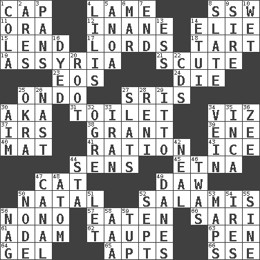 ACROSS 1. Head covering 4. Unable to walk 8. Compass dir. 11. Mouth or opening 12. Lacking in sense or substance 14. Writer Wiesel 15. Grant temporary use of 17. Domineers 18. Small pie 19. Nineveh was its capital 21. Scutum 23. Greek goddess of the dawn 24. Expire 25. Southwest Nigerian state 27. Indian titles of respect 30. Alias (abbr.) 31. Bathroom 34. That is 37. Big collection agency 38. Monetary aid 39. Compass dir. 40. Floor protector 41. Food allowance for one day 43. Frozen water 44. Elected reps. 45. Inactive volcano in Sicily 47. Feline 49. Fool 50. Relating to or accompanying birth 52. Deli grouping 56. Words to Nanette 57. Eroded 60. Indian skirt 61. First man 62. Grayish beige 63. Writing instrument 64. Set 65. Tenement units (abbr.) 66. Compass dir. DOWN 1. Root beer relative 2. Ancient Greek god of war 3. Zero-star reviews 4. Ms. Damita and namesakes 5. Small Philippine buffalo 6. Make imperfect 7. Conclude 8. Chalkboard 9. Father 10. Soggy 13. Double-curved letter 14. Needle case 16. Colored 20. Carrot, for example 22. Music discs 25. Gumbo ingredient 26. Political cartoonist Thomas 27. Narrow boards 28. Painter Guido (1575-1642) 29. "Tell ____ the Marines!" 30. Direct toward a target or goal 32. Legendary monster 33. SW Asia republic 34. Distinctive style or manner 35. South American Indian 36. Last letter of the English alphabet 42. Be tempered by heat 44. R.R. building 46. It was, poetically 47. Lessep's creation 48. Tiny particle 49. Natives or inhabitants of Denmark 50. Thickened enlargement 51. Allow 52. Back-to-school mo. 53. Atlas contents 54. Angers 55. Trig term 56. Tired old horse 58. Auto club (abbr.) 59. Uncastrated adult male sheep