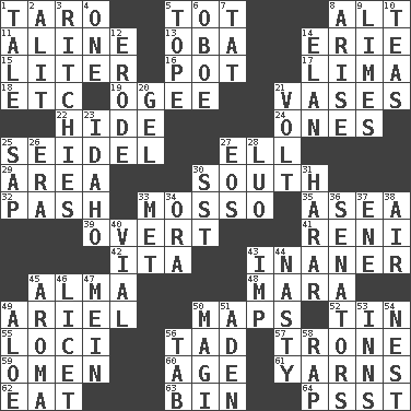 ACROSS 1. Pacific island yam 5. Small child 8. The first octave above the treble staff 11. Place in a line 13. Chief or king in Benin or Nigeria 14. One of the Great Lakes 15. 61 cubic inches 16. Cooking vessel 17. Pale green bean 18. And so on (abbr.) 19. Double curve, resembling the letter S 21. Flower holders 22. Flintstone garb 24. Washington bills 25. A glass for beer 27. Pipe bend 29. Type of rug 30. Compass direction 32. Romantic infatuation 33. With motion or animation 35. At sea 39. Unconcealed 41. Painter Guido (1575-1642) 42. Call ___ day 43. More empty; more void 45. _ mater 48. Hindu Mythology: god of death 49. Satellite of Uranus 50. Atlas contents 52. Metal container 55. Locales 56. Small boy 57. Heavy duty weighing machine 59. Sign of things to come 60. Grow older 61. Entertaining tales 62. Consume 63. Storage container 64. Inconspicuous attention getter DOWN 1. Lie 2. Set down 3. Actors Guy, Robert Welles, and Clint 4. Single 5. Drink excessively 6. Mitch Miller's instrument 7. Make lace 8. Originate 9. Citrus fruits 10. Beverages made from leaves 12. Eat (away) 14. Enthusiasm 20. Set 21. Electrical Unit 23. Potato state 25. Plant excrement 26. Epoch 27. Greek goddess of the dawn 28. Nilotic language 30. Fast jet (abbr.) 31. Ethiopian city, capital of Harari 33. Was introduced to 34. Mouth or opening 36. Elected representatives 37. Compass dir. 38. Wind 40. Small bottle 43. Mischievous child 44. Offensive 45. Scent 46. It is permitted: Lat. 47. Count _ (2 wds.) 49. Medicinal plant 50. Wise men 51. Arabian gulf 53. Taverns 54. Egg locale 56. Bar bill 58. Hit sharply and swiftly