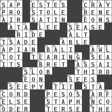 ACROSS 1. Plant excrement 4. _____ Park, CO 9. Supercomputer manufacturer 13. Adept person 14. Took without asking 15. French philosopher Descartes 16. Wind 17. Smooth fabric 18. Immeasurably long periods of time 19. _ moment's notice (2 wds.) 21. Area sheltered from the wind 22. Gospel singer Marvin 24. Travel on an animal 26. Keyboard modifier key 27. Sadhe (variant) 29. Competent 30. Bee-related 31. Indonesian resort city 33. Leather borer 36. Small child 37. Pulling into pieces 40. Ocean 41. It is 42. Cy Young winner Saberhagen 43. Slender Brazilian palm 45. Oscar Madison type 47. One of three equal parts 48. Period of immesurable duration 49. Perceives with the eye 50. Oozy 52. Teat (slang) 54. R.R. building 56. Drawstring 57. Mexican monetary units 59. Sandy's bark 61. Otherwise 62. Staphylococcus 63. Non-commissioned officer (abbr.) 64. Baltic tributary 65. Laconic 66. Definite Article DOWN 1. Health resort 2. Roberta Peters solo 3. Likenesses of persons 4. Double-curved letter 5. Lacking originality or spontaneity 6. Carryall 7. Writer Wiesel 8. Elected rep. 9. Cause to be 10. Vintage cars 11. Queen of England 1702-14 12. Affirmative reply 20. Opera by Verdi 22. Unit of acoustic absorption 23. Pipe bend 25. Incision 27. Jacques of French films 28. Blemish 29. Came down and settled, as after flight 31. Sharp remark 32. "We ___ not amused" (Victoria) 33. Helper 34. Erode 35. Put down 38. Black 39. Yard entry 44. "______ My Girl" (Turtles hit) 45. Sowing specialist 46. Chop off 49. Halts 50. Exchanged or delivered for money 51. Celtic language 52. False hair 53. Austrian river, tributary to the Danube 55. Bowlike part 56. Corporate head (abbr.) 57. Pacific Standard Time (abbr.) 58. A female animal or person 60. Enemy