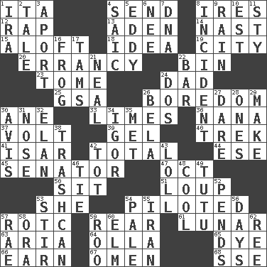 ACROSS 1. Call ___ day 4. Post 8. Angers 12. Hit sharply and swiftly 13. An important port of Yemen 14. Political cartoonist Thomas 15. At or to great height 18. It may be bright or harebrained 19. Municipality 20. The state or an instance of erring 22. Storage container 23. Heavy book 24. Male parent 25. Girls' org. (abbr.) 26. Mood resulting from idleness 30. One (Scot) 33. Citrus fruits 36. Nanny 37. Electrical Unit 39. Set 40. Long journey 41. Austrian river, tributary to the Danube 42. Add up to 44. Compass dir. 45. Legislator 47. Sep. follower 50. Be seated 51. Central Nebraska county 53. A female animal or person 54. Manned the helm 57. College mil. group 59. Located in or toward the back 61. Type of eclipse 63. Roberta Peters solo 64. Water jar 65. Color 66. Merit 67. Sign of things to come 68. Compass dir. DOWN 1. Retirement account (abbr.) 2. Story 3. To the left, to Queeg 4. Ketch in the Levant 5. Whirlpool 6. Born 7. Heredity factor (abbr.) 8. Event 9. Water falling in drops from the sky 10. Eastern Standard Time (abbr.) 11. Filthy place 16. Toadlike animal 17. Scottish caps 21. Anneal 22. Long, evenly shaped piece 24. Two (Sp.) 26. Actor Lugosi 27. Have the gumption 28. Singles 29. Create 30. Advice 31. Sense of smell 32. Style 34. Russian composer Stravinsky 35. Was introduced to 38. File 13 42. Small child 43. Hang loosely or laxly 46. Make a knot 48. Calm and collected 49. Ballerina skirt 52. Depends 53. Disorderly outburst 54. Light colored 55. SW Asia republic 56. 24-hour periods 57. Actress Charlotte 58. Mouth or opening 59. Friend of Pooh 60. Shade tree 62. To separate or throw off