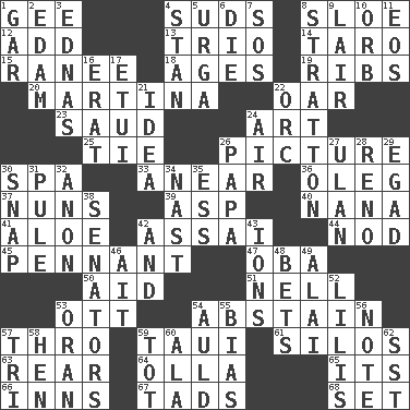 ACROSS 1. Unit of force equal to gravity 4. Beer foam 8. _ gin 12. Find the sum of 13. Musical group of three 14. Pacific island yam 15. Indian princess (variant) 18. Ripens 19. Teases 20. Chrissie's court nemesis 22. Rowing implement 23. Saudi Arabian king (1953-1964) 24. Tate display 25. Standoff 26. Photo 30. Health resort 33. Approach 36. Cassini of fashion 37. Religious women 39. Viper 40. Nanny 41. _ vera 42. Slender Brazilian palm 44. Lower and raise head in agreement 45. Pre-World Series prize 47. Chief or king in Benin or Nigeria 50. Assist 51. 1994 drama film starring Jodie Foster 53. Baseball player Mel 54. Choose not to consume 57. Through, poetically 59. "Change" in Tahitian 61. Grain storage towers 63. Stern 64. Rounded earthenware pot or jar 65. It is 66. Restaurants 67. Small boys 68. Put into a specified state DOWN 1. Slender fish 2. Dutch treat 3. Ferber et al. 4. Comedian Laurel of Laurel & Hardy 5. Capital and largest city of Mongolia 6. Pass on 7. Distress signal 8. Ski resort town in Vermont 9. Den 10. Globe 11. Greek goddess of the dawn 16. Part of Q.E.F. 17. Needle case 21. It may be bright or harebrained 22. The grampus (Milton) 24. Atmosphere 26. Dad 27. ____ Bator 28. Former U.S. Attorney General Janet 29. Mild oath 30. Fastener 31. Whine 32. Soon (poet.) 34. Political cartoonist Thomas 35. Curvy letter 38. Legislators 42. Also 43. Charged particles 46. Small island 48. Wagers 49. Jai _ 52. Ms. Damita and namesakes 53. Northwest Algerian city 54. Old (Scot.) 55. Prejudice 56. Brief written record 57. Three (prefix) 58. Layer 59. Small child 60. Wing 62. Fast jet (abbr.)