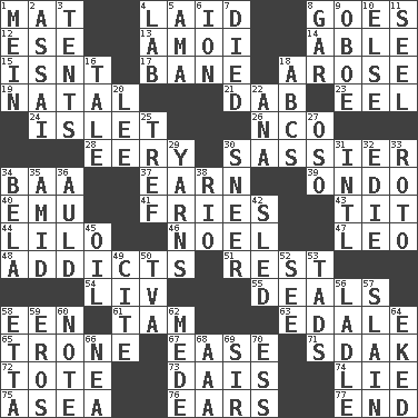ACROSS 1. Floor covering 4. Put down 8. Leaves 12. Compass dir. 13. Mine, in Marseilles 14. Competent 15. Is not 17. Object of repulsion 18. Came up 19. Brizilian seaport 21. Small moist lump or mass 23. Snakelike fish 24. Small island 26. Non-commissioned officer (abbr.) 28. Suggestive of the supernatural 30. More impudent 34. Sound made by sheep 37. Merit 39. Southwest Nigerian state 40. Australian flightless bird 41. Strips of potato fried in deep fat 43. Teat (slang) 44. _ and Stitch 46. Christmas carol 47. Lion 48. Inveterate users 51. Respite 54. 54 in ancient Rome 55. Allots cards 58. Car or cant ending 61. Scottish cap 63. Peak District village in England 65. Marketplace scale 67. Relaxation 71. Neighbor of Neb. 72. Carryall 73. Raised platform 74. Falsehood 75. Toward the sea 76. Hearing organs 77. Conclusion DOWN 1. Chow _ 2. Slender Brazilian palm 3. Portable shelters 4. Experiment locale 5. Nursemaid (var.) 6. Electrically charged atom 7. Passed on 8. Slender fish 9. Mitch Miller's instrument 10. Otherwise 11. Sew up the eyelids of hawks and falcons 16. Falsehood 18. Lettered men learn these first 20. Area sheltered from the wind 22. Santa ___, CA 25. Not kosher 27. Bear (Spanish) 29. Tall tales 30. Scornful expression 31. International (abbr.) 32. Singer Brickell 33. Printing process, for short 34. Actor Lugosi 35. Among 36. Old (Scot.) 38. _ de Janeiro 42. Downhill vehicle 45. Lubricate 49. Quote 50. Federal power corp. 52. Perceive with the eye 53. Bits 56. Dipping utensil 57. Killed 58. Singer James 59. Greek god of love 60. Musical sound 62. Ancient Persian 64. Made supply last 66. Teachers' org. 68. Auto club (abbr.) 69. Title for a knight 70. Double-curved letter