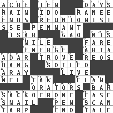 ACROSS 1. Land measure 5. "___ Little Indians" 8. 24-hour periods 12. Precipitation 13. Wedding promise 14. The wife of a rajah (variant) 15. Extremities 16. One who advocates reunion 19. Compass dir. 20. Pre-World Series prize 21. Russian ruler of old 23. E Mali city 24. Mountains (abbr.) 27. Mediterranean tributary 30. Conductor's collection 31. Develop 34. Roberta Peters solo 35. The sixth month of the Jewish calendar 38. Collection of objects 40. Vintage cars 41. Mild oath, euphamism for damn 42. Dirtied 44. Like ___ of sunshine 45. Moving, as bait 46. Cartoonist voice _ Blanc 47. The 23rd letter of the Hebrew alphabet 50. Flair 53. Speakers 57. Drinking establishment 59. Italian handbag shop? 63. Comfort 64. Slow-paced one 65. Fenced enclosure 66. Skim 67. Canvas cover 68. Conclude 69. Story DOWN 1. Ancient Greek god of war 2. 2nd pers. sing. pres. of can (arch.) 3. Amusement-park features 4. Followers of ems 5. Become fatigued 6. Paradise 7. Part of speech 8. Daniel's nick name 9. Black tropical American cuckoo 10. It is so 11. Arrange properly for use 14. Printing process, for short 17. Tired old horse 18. _ tizzy (2 wds.) 20. Demure 22. Disorder of the immune system 24. Female horse 25. Musical group of three 26. Oceans 28. Allow 29. Blunders 30. Pack 32. Thick or sticky substance 33. Tending to cause great harm 35. First man 36. Have the gumption 37. Of or related to the anus 39. Biblical high priest 43. Nights before holidays 47. Instrument 48. Sandy's bark 49. Armed conflict 51. Phillipine bananalike plant 52. Relating to the nose 54. Drink excessively 55. Presage 56. Tear apart 58. French philosopher Descartes 59. Fast jet (abbr.) 60. Santa ___, CA 61. Automobile 62. Sleep 63. Eastern Standard Time (abbr.)