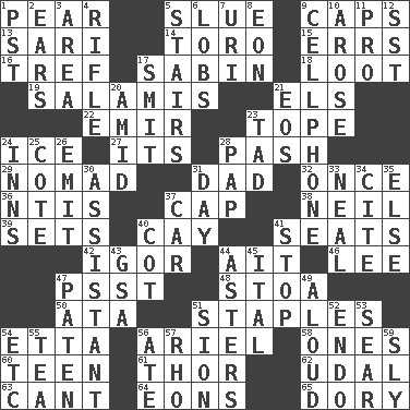 ACROSS 1. Lightbulb-shaped fruit 5. Change direction abruptly 9. Smile enhancers 13. Indian skirt 14. "Corrida" creature 15. Blunders 16. Unclean, religiously 17. Unit of acoustic absorption 18. Plunder 19. Deli grouping 21. Raised railways 22. Independent ruler or chieftain 23. Drink excessively 24. Frozen water 27. It is 28. Romantic infatuation 29. Roamer 31. June honoree 32. At one time in the past 36. Nuclear Threat Initiatives 37. Head covering 38. Famous astronaut Armstrong 39. Arranges properly for use 40. Island 41. Theater features 42. Russian composer Stravinsky 44. Small island 46. Area sheltered from the wind 47. Inconspicuous attention getter 48. Portico 50. _ moment's notice (2 wds.) 51. Paper fasteners 54. Singer James 56. Satellite of Uranus 58. Singles 60. Adolescent 61. Son of Odin 62. Allodial 63. Patter 64. Immeasurably long periods of time 65. Rowboat DOWN 1. Pacific Standard Time (abbr.) 2. Hearing organs 3. Length times width 4. Ransack; plunder; pillage 5. Flight of steps 6. Tennis shots 7. RI univ. 8. Period of immesurable duration 9. Portable communications device 10. Came up 11. Adept person 12. Fast jet (abbr.) 17. Stricken, poetically 20. Among 21. Greek goddess of the dawn 23. Small amount or degree 24. Lodging establishments 25. ____ d'Azur (French Riviera) 26. Give off 28. Infant food 30. Helper 31. 24 hours 33. Anneal 34. Quote 35. Otherwise 37. Automobile 40. Small bed 41. Close up, plug up 43. Girls' org. (abbr.) 44. Michaelmas daisies 45. Slanted text style (abbr.) 47. Eucharist need 49. Verbally 51. The Jewish people; Israel 52. Inside; within (prefix) 53. Shrivel 54. And so on (abbr.) 55. Beverage made from leaves 56. Had dinner 57. 17th letter of the Greek alphabet 59. Secret