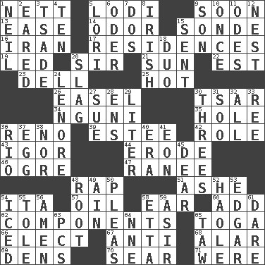 ACROSS 1. Remaining after all deductions 5. Farming town in central California 9. Within a short period 13. Comfort 14. Scent 15. Something which is sent 16. SW Asia republic 17. Homes 19. Directed 20. Title for a knight 21. Player for Phoenix 22. Eastern Standard Time (abbr.) 23. Small valley 25. Being at a high temperature 26. Artist's stand 30. Russian ruler of old 34. Group of southern Bantu languages 35. Hollow 36. Former U.S. Attorney General Janet 39. First name in cosmetics 42. Hero or heavy, e.g. 43. Composer Stravinsky 44. Eat (away) 46. Legendary monster 47. Indian princess (variant) 48. Reproach for some lapse or misdeed 51. American tennis player Robert 54. Call ___ day 57. Lubricate 58. Hearing organ 60. Increase 62. Pieces 65. Ancient Roman robe 66. Voters do this 67. Against 68. Having or resembling wings 69. Habitations of wild animals 70. Scorch 71. We are DOWN 1. Famous astronaut Armstrong 2. Having ears or earlike features 3. Sadhe (variant) 4. Nine, plus one 5. Australian parrot (variant) 6. River in Europe 7. Two (Sp.) 8. From or relating to Ireland 9. Manchild 10. Single time 11. Lyric poems 12. Egg locale 15. Transmitted 18. Superhero pair 20. Volcanic refuse 24. Poe poem 27. Institute legal proceedings 28. Followers of ems 29. 61 cubic inches 30. Triads 31. "Barney Miller" actor Jack 32. Everything 33. Portuguese money of account (variant) 36. _ de Janeiro 37. Oval reproductive body of a fowl 38. Not either 40. Epoch 41. Period of immesurable duration 45. Letter starter 48. Carrot, for example 49. The 18th letter of the Arabic alphabet 50. Entreaties 52. White Person, in Hawaii 53. _ Allan Poe 54. On the rocks 55. Lacquered or enameled metalware 56. So be it 58. Singer James 59. SW Saudi Arabia district 61. Have the gumption 63. Personal Computers (abbr.) 64. Compass dir. 65. The 23rd letter of the Hebrew alphabet