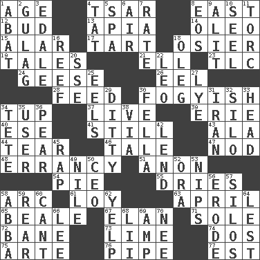 ACROSS 1. Ripen 4. Russian ruler of old 8. Compass direction 12. Partially opened flower 13. Capital of Western Samoa 14. Margarine 15. Having or resembling wings 17. Small pie 18. Flexible twig of a willow tree 19. Stories 21. Pipe bend 23. Affectionate concern, for short 24. Honkers 26. Snakelike fish 28. Nourish 30. Out of fashion; old fashioned 34. Uncastrated adult male sheep 37. Moving, as bait 39. One of the Great Lakes 40. Compass dir. 41. Free of sound 43. According to 44. Pull into pieces 46. Falsehood 47. Lower and raise head in agreement 48. Tendancy to err 51. At once, immediately (arch.) 54. Sliced dessert 55. Frees from moisture 58. Curve 61. Myrna of the movies 63. Showery time 65. Memphis, Tenn. Street 67. Flair 71. Not divided or shared with others 72. Object of repulsion 73. Welles in "The Third Man" 74. Two (Sp.) 75. Johnson of "Laugh-In" 76. Corncob 77. Eastern Standard Time (abbr.) DOWN 1. Blind as ____ 2. Russian prison camp 3. Peak District village in England 4. Make lace 5. Health resort 6. Atmosphere 7. Assign a rank or rating to 8. Greek goddess of the dawn 9. Set down 10. Stitch closed the eyes of (a falcon) 11. Torque (variant) 16. Coral collection 18. Cassini of fashion 20. Compass dir. 22. Lion 25. Snakelike fish 27. Potassium hydroxide 29. Short, simple song 30. Chap (slang) 31. SW Asia republic 32. Grain storage tower 33. Froth on beer 34. Wig 35. One who uses or employs something 36. Lightbulb-shaped fruit 38. By way of 42. Grant temporary use of 45. Reproach for some lapse or misdeed 49. "Death on the ____" 50. Corporate head (abbr.) 52. Mouth or opening 53. Pinches, bites 56. Eat (away) 57. Grain storage towers 58. Swedish rock group 59. Hitchcock's "____ Window" 60. Patter 62. Sharp bark 64. For fear that 66. Area sheltered from the wind 68. Cards in a Roman deck? 69. Electrical Unit 70. Born