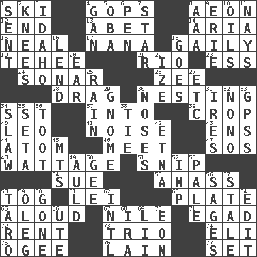 ACROSS 1. What Jean-Claude Killy likes to do 4. Republicans 8. A really long time 12. Conclude 13. Collude with 14. Operatic vocal solo 15. Be tempered by heat 17. Nanny 18. Lightheartedly 19. Giggle 21. River (Sp.) 23. Curvy letter 24. Echolocation 26. Last letter of the English alphabet 28. To trail on the ground 30. Inhabiting a nest 34. Fast jet (abbr.) 37. To the inside or interior of 39. Riding implement 40. Lion 41. Annoying sound 43. Followers of ems 44. Smallest unit of an element 46. Rendezvous 47. Distress signal 48. Electrical Measurement 51. Sever or remove by pinching or nipping 54. Institute legal proceedings 55. Collect or gather 58. Coat; cloak 61. Flowery wreath 63. Food holder 65. Verbally 67. The longest river in the world 71. Mild oath 72. Monthly bill 73. Musical group of three 74. Biblical high priest 75. Double curve, resembling the letter S 76. (Had) reclined 77. Arrange properly for use DOWN 1. Posted 2. Leg joints 3. Potato state 4. Separate the seeds from cotton 5. Chief or king in Benin or Nigeria 6. Animal enclosure 7. Play the lead 8. American Automobile Association (abbr.) 9. One of the Great Lakes 10. Lubricates 11. Negative votes 16. Grant temporary use of 18. Leaves 20. Hearing organ 22. Ending with capital 25. Precipitation 27. And so on (abbr.) 29. Dwarf 30. Olfactory organs 31. Angers 32. Words to Nanette 33. Global Positioning Systems (abbr.) 34. Cole _ (cabbage dish) 35. Bristle 36. A blast of a horn 38. Neckwear 42. Inactive volcano in Sicily 45. Mountains (abbr.) 49. Old (Scot.) 50. Unit of force equal to gravity 52. Mischievous child 53. Diluted with white 56. Gurus 57. Lacking originality or spontaneity 58. Pacific island yam 59. Cassini of fashion 60. Went 62. International (abbr.) 64. Prepare for publication 66. Shoshoni 68. Retirement account (abbr.) 69. Cards in a Roman deck? 70. Age