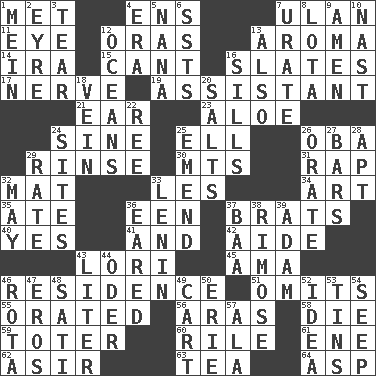 ACROSS 1. Was introduced to 4. Followers of ems 7. ____ Bator 11. Sight organ 12. Mouths or openings 13. Odor 14. Lyricist Gershwin 15. Patter 16. Chalkboards 17. Impudent aggressiveness 19. Aide 21. Ewer handle 23. Medicinal plant 24. Trig term 25. Pipe bend 26. Chief or king in Benin or Nigeria 29. Wash lightly 30. Mountains (abbr.) 31. Hit sharply and swiftly 32. Floor covering 33. French article 34. Tate display 35. Had dinner 36. Car or cant ending 37. Naughty children 40. It is so 41. Added to 42. Assistant 43. Australian parrot (variant) 45. Housemaid (var.) 46. Home 51. Leaves out 55. Declaimed 56. Ancient river in northeast Turkey 58. Pass on 59. Carrier 60. Cause heat under the collar 61. Compass dir. 62. SW Saudi Arabia district 63. Beverage made from leaves 64. Cleo's killer DOWN 1. Chow _ 2. Jane of fiction 3. Rend 4. Epoch 5. Grandmother 6. Fast planes 7. A salt of uric acid 8. Globular water bottle used in Asia 9. So be it 10. Political cartoonist Thomas 12. Seas 13. In addition 16. Beverly of Met fame 18. Distinctive style or manner 20. Table seasonings 22. To sift 24. Locates 25. Make improvements or corrections to 26. Declaim 27. Soap units 28. Fitting 29. Pace 32. Can I? 33. Soviet premier 1918-24 36. Having ears or earlike features 37. Sound made by sheep 38. Full of chinks, cracks, or crevices 39. First of billions? 43. 61 cubic inches 44. River in Europe 46. Roll call or roster of names 47. Greek god of love 48. Suttee (variant) 49. Draw slowly or heavily 50. One of the Great Lakes 52. The content of cognition 53. Canisters 54. Ooze 57. Wing