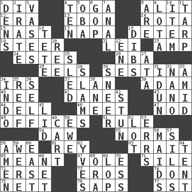 ACROSS 1. HTML Container Element 4. Ancient Roman robe 8. Set down 12. Period 13. Inky black, to poets 14. Roll call or roster of names 15. Political cartoonist Thomas 17. California wine valley 18. Prevent from occurring 19. Navigate 21. Flowery wreath 23. Electrical Unit 24. _____ Park, CO 26. Basketball assoc. 28. Snakelike fish 30. French poetic form 34. Big collection agency 37. Liveliness 39. First man 40. Born 41. Natives or inhabitants of Denmark 43. Corn or form start 44. Small valley 46. Rendezvous 47. Dreamland 48. Positions of authority 51. General guideline 54. Simpleton 55. Typical models 58. Deep reverence 61. Marina Del _, California 63. Distinguishing feature 65. Intended 67. Grand slam 71. Filth; sediment 72. Celtic language 73. Greek god of love 74. Spanish title 75. Remaining after all deductions 76. Plant excrements 77. Fast jet (abbr.) DOWN 1. Hiding places for outlaws 2. Feeling or showing extreme anger 3. Flower holders 4. "___ Little Indians" 5. Chief or king in Benin or Nigeria 6. Grand Old Party 7. Of or related to the anus 8. "We ___ not amused" (Victoria) 9. Globular water bottle used in Asia 10. A whole individual unit 11. Canvas cover 16. Wig 18. Claim 20. To riddle 22. Compass dir. 25. Downhill vehicle 27. "One Day ___ Time" 29. Shuts with force 30. Scornful expression 31. Goddess of spring and wife of Bragi 32. Billionth: prefix 33. Among 34. Southeast Asian peninsula 35. Coral collection 36. Automatically 38. A saturated hydrocarbon 42. Surprise greatly 45. Hat (slang) 49. Haul 50. She-sheep 52. Car dealer's back yard 53. Blunders 56. Unmarried girls 57. Grain storage towers 58. So be it 59. Past tense of be (plural) 60. Compass direction 62. Jacques Cousteau's middle name 64. Portable shelter 66. Fish or hair follower 68. Mouth or opening 69. Trim (branches) 70. Double-curved letter