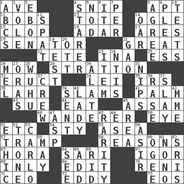 ACROSS 1. "___ Maria" 4. Clip 8. Fitting 11. Moves up and down 13. Carryall 14. Stare 15. Hoof sound 16. The sixth month of the Jewish calendar 17. Ancient Greek god of war 18. Legislator 21. Relatively large 22. False hair 23. _ tizzy (2 wds.) 25. Double-curved letter 26. Cut the grass 29. Ski resort town in Vermont 32. Spew [out] 34. Flowery wreath 35. Big collection agency 38. Cowardly lion portrayer 39. Hits or strikes with great force 41. Inside of hand 43. Take to court 44. Erode 45. Indian state 46. Nomad 50. Sight organ 51. And so on (abbr.) 54. Filthy place 55. At sea 57. _____ steamer (cargo ship) 59. Thinks logically 63. Israeli folk dance 64. Indian skirt 67. Russian composer Stravinsky 68. Inwardly 69. Prepare for publication 70. Painter Guido (1575-1642) 71. Corporate head (abbr.) 72. Whirlpool 73. Greek goddess of the dawn DOWN 1. Lettered men learn these first 2. Grand slam 3. Inky black, to poets 4. A viewer who gazes fixedly 5. Dreamland 6. Call ___ day 7. For each 8. Match 9. Entreaties 10. Trials 12. Argument over a trivial matter 14. Boat paddle 19. Trial 20. Baseball player Mel 21. E Mali city 23. Detail 24. Nuclear Threat Initiatives 26. Cartoonist voice _ Blanc 27. Mouths or openings 28. Chinese city south-southwest of Nanjing 30. Having winglike extensions 31. Cuts off 33. Ship's personnel 36. Raze (variant) 37. Kill 39. Emitted 40. Kenny Rogers chart-topper in '80 42. Madame (abbr.) 45. Type of rug 47. Viper 48. Noteworthy scarcity 49. Compass dir. 51. Moral principle 52. Marketplace scale 53. Monte _, Las Vegas Hotel/Casino 56. SW Saudi Arabia district 58. Can I? 60. Double curve, resembling the letter S 61. Words to Nanette 62. Indian titles of respect 64. Observe 65. Increase 66. To free from