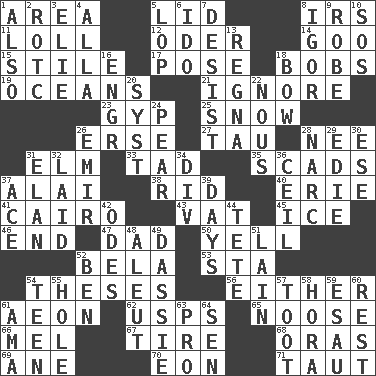 ACROSS 1. Type of rug 5. Hat (slang) 8. Big collection agency 11. Hang loosely or laxly 12. Baltic tributary 14. Thick or sticky substance 15. Vertical member of a panel or frame 17. Introduce or present, as a question 18. Moves up and down 19. Seas 21. Disregard 23. Flimflam 25. Frozen precipitation 26. Celtic language 27. The 19th letter of the Greek alphabet 28. Born 31. Shade tree 33. Bit 35. Tons 37. Mountain range southwest of Kyrgyzstan 38. To free from 40. 4th largest of the Great Lakes 41. Capital of Egypt 43. Large container 45. Frozen water 46. Conclusion 47. Male parent 50. Shout 52. Actor Lugosi 53. R.R. building 54. College papers 56. One or the other 61. Age 62. United States Postal Service (abbr.) 65. Trap for birds or small mammals 66. Cartoonist voice _ Blanc 67. Hoop that covers a wheel 68. Mouths or openings 69. A saturated hydrocarbon 70. Age 71. Tense DOWN 1. In addition 2. College mil. group 3. Writer Wiesel 4. Silent film actress Nazimova 5. Trim (branches) 6. Wedding promise 7. Stop 8. Composer Stravinsky 9. Loose flowing garment 10. Distress signal 13. Rain (Swedish) 16. Engineer (abbr.) 18. Ribbon knot 20. System (abbr.) 22. Common sense 24. Lightbulb-shaped fruit 26. Independent ruler or chieftain 28. Drug cop 29. Singer Brickell 30. Compass dir. 31. Flair 32. Put down 34. HTML Container Element 36. To provide with a ceiling 37. Adept person 39. 24-hour periods 42. Lyric poems 44. Wig 48. Native American of Southwest Alaska 49. Hyrax 51. (Had) reclined 52. Benjamin's nick name 54. Adolescent 55. Hollow 57. A blast of a horn 58. Israeli folk dance 59. He sold his birthright 60. Relief 61. Nursemaid (var.) 63. Adept person 64. Elected rep.