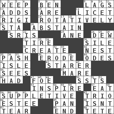 ACROSS 1. Shed a tear 5. Benjamin's nick name 8. Falls behind 12. Does sums 13. "We ___ not amused" (Victoria) 14. It is permitted: Lat. 15. Swiss mountan, "Queen of the Mountains" 16. Rotating or pertaining to rotation 19. R.R. building 20. Choose not to consume 21. Indian titles of respect 23. One (Scot) 24. Morning condensation 27. Become fatigued 30. Drop; flow; fall 31. Make 34. Egg locale 35. Romantic infatuation 38. Wear away 40. Lyric poems 41. Capri or Wright 42. A viewer who gazes fixedly 44. Observes 45. Female horse 46. Possessed 47. Enemy 50. Fast planes 53. Motivate 57. Ingest 59. Supplementary 63. Musical group of three 64. First name in cosmetics 65. Baking dish 66. Is not 67. Rend 68. Conclusion 69. False hair DOWN 1. Armed conflicts 2. Proofreads 3. _ Allan Poe 4. Air pressure measure (abbr.) 5. Sharp remark 6. Greek god of love 7. Remaining after all deductions 8. 54 in ancient Rome 9. Adept person 10. Set 11. Filthy place 14. Actor's bit 17. Auto club (abbr.) 18. Metal container 20. SW Saudi Arabia district 22. Skin irritations 24. Passed on 25. Otherwise 26. Soaks 28. Portuguese money of account (variant) 29. Hearing organs 30. Sounds asleep 32. Small child 33. Dutch treat 35. Expression of disdain 36. At sea 37. Downhill vehicle 39. Epoch 43. Celtic language 47. Do some clerical work 48. Single 49. Eastern Standard Time (abbr.) 51. Laconic 52. Virtuous person 54. Corncob 55. _ the terrible 56. Tear apart 58. Carry 59. Arrange properly for use 60. Purpose 61. Parent Teacher Assoc. 62. For each 63. Teat (slang)