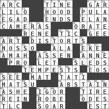 ACROSS 1. Curve 4. Prong on a fork 8. Slender fish 11. _ and Stitch 13. Parka part 14. Monetary unit of Botswana 15. Mild oath 16. Extremities 17. Liveliness 18. Devices for capturing images 21. Declaim 22. French philosopher Descartes 23. Nervous spasm 25. Unit of force equal to gravity 26. Nonscientific branch of learning 29. What propaganda does 32. With motion or animation 34. Wing 35. Make supply last 38. Nursemaid 39. NE Netherlands city 41. Queen of England 1702-14 43. Adept person 44. Allow 45. Bobsleighs 46. Storms 50. Greek goddess of the dawn 51. Observe 54. Floor covering 55. Jacques of French films 57. Taiwanese island in East China Sea 59. Choose not to consume 63. American tennis player Robert 64. Composer Stravinsky 67. Hoop that covers a wheel 68. It's straight from the horse's mouth 69. Loose flowing garment 70. Lyric poems 71. Affectionate concern, for short 72. Fly high 73. Eastern Standard Time (abbr.) DOWN 1. Actor Baldwin 2. Capital of Latvia 3. Dollar (slang) 4. College papers 5. Electrically charged atom 6. Lower and raise head in agreement 7. Begley and Asner 8. POW camp 9. Having winglike extensions 10. The wife of a rajah (variant) 12. Baltic tributary 14. For each 19. Make new 20. Black tropical American cuckoo 21. Sep. follower 23. Lacquered or enameled metalware 24. SW Asia republic 26. Nursemaid (var.) 27. Frolic 28. Russian ruler of old 30. Clothes sense 31. Lick closed 33. Attempt 36. Leg joint 37. Inside; within (prefix) 39. _ mater 40. Back-to-school mo. 42. Double-curved letter 45. Fast planes 47. Australian flightless bird 48. A viewer who gazes fixedly 49. Bar bill 51. Don Adams' spy role 52. Artist's stand 53. Principle of right and wrong 56. "Tell ____ the Marines!" 58. Elected rep. 60. Helper 61. Angers 62. A home for chicks 64. Big collection agency 65. Thick or sticky substance 66. Chief or king in Benin or Nigeria