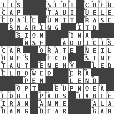 ACROSS 1. It is 4. Notch 8. "Mermaids" star 12. Head covering 13. "Change" in Tahitian 14. Ubangi River tributary 15. Peak District village in England 18. A single undivided whole 19. Raze (variant) 20. Catching in a trap 22. It would 23. The Jewish people; Israel 24. _ tizzy (2 wds.) 25. Overdraft (abbr.) 26. Inveterate users 30. 4-wheeled motor vehicle 33. Declaim 36. Famous astronaut Armstrong 37. Singles 39. Environmental prefix 40. Trig term 41. Strained 42. Foe 44. Directed 45. Turned at an angle; bent 47. Period 50. Animal enclosure 51. Grant temporary use of 53. Choose 54. Normal relaxed breathing 57. Australian parrot (variant) 59. Writing tablets 61. Eating place 63. SW Asia republic 64. Queen of England 1702-14 65. In the manner of 66. Mild oath, euphamism for damn 67. Letter starter 68. Slender fish DOWN 1. Frozen water 2. Small amounts or degrees 3. Connects, as a bridge 4. Surprise greatly 5. Austrian-born American filmmaker Fritz 6. Fr. "Yes" 7. Teat (slang) 8. Window treatments 9. Froth on beer 10. Raised railways 11. To sift 16. (Had) reclined 17. Greek god of love 21. A message received and understood 22. Indiana (abbr.) 24. Binary compound 26. Smallest unit of an element 27. To provide with a ceiling 28. Prong on a fork 29. Downhill vehicle 30. ____ d'Azur (French Riviera) 31. Of or related to the anus 32. Reuben's nickname 34. Tear apart 35. Adept person 38. Obstructing or blocking passage 42. Car or cant ending 43. Sharp bark 46. Dripping 48. Monthly bill 49. Small Philippine buffalo 52. Debunk (Brit. slang) 53. NW Algerian seaport 54. Pulitzer Prize-winning author Ferber 55. One who makes use of a thing 56. Silent film actress Nazimova 57. Hat (slang) 58. Mouth or opening 59. Groovy apt. 60. A saturated hydrocarbon 62. Ewer handle