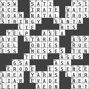 ACROSS 1. Compass dir. 4. Suttee (variant) 8. Air pressure measure (abbr.) 11. Adept person 12. Feeling or showing extreme anger 14. Electrical Unit 15. Wander aimlessly 17. Brizilian seaport 18. Greek god of love 19. Slender, wiry 21. Before Barbara or Clara 23. Falsehood 24. Mountains (abbr.) 25. Sharp bark 27. At sea 30. "___ Maria" 31. A viewer who gazes fixedly 34. Viper 37. Set 38. Off-Broadway awards 39. Sorrow 40. Double-curved letter 41. Makes clutter 43. Nine, plus one 44. False hair 45. Grows older 47. Girls' org. (abbr.) 49. White ___ sheet 50. Eat (away) 52. Center 56. Length times width 57. Tall tales 60. Cowardly lion portrayer 61. One who doesn't tell the truth 62. Dodge 63. Teachers' org. 64. Allow 65. Age 66. Nonscientific branch of learning DOWN 1. Armed conflicts 2. Highlander 3. Erode 4. Burn superficially 5. Like ___ of sunshine 6. Make lace 7. Call ___ day 8. Components 9. Portico 10. ___ a Wonderful Life 13. Raised railways 14. Gone 16. Place where flour is made 20. Cuts off 22. Nanny (var.) 25. Jacques Cousteau's middle name 26. Snakelike fish 27. Get up 28. Observes 29. Celtic language 30. Grow older 32. Heavy book 33. Collude with 34. Johnson of "Laugh-In" 35. Takes to court 36. Fenced enclosure 42. Backtalk 44. Small boy 46. Highlander 47. Relatively large 48. Fly high 49. NE Netherlands city 50. 4th largest of the Great Lakes 51. Sight organ 52. Inside; within (prefix) 53. Grandmother 54. "Mermaids" star 55. Part of Q.E.F. 56. 100% 58. Actress Gardner 59. Actress Charlotte