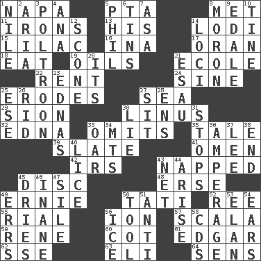 ACROSS 1. California wine valley 5. Parent Teacher Association (abbr.) 8. Was introduced to 11. Metal shackles 13. Part of HMS, perhaps 14. Farming town in central California 15. Pale purple color 16. _ tizzy (2 wds.) 17. Northwest Algerian city 18. Ingest 19. Lubricates 21. Learning spot: Fr. 22. Monthly bill 24. Trig term 25. Eats (away) 27. Ocean 29. The Jewish people; Israel 30. "_ and Lucy" (Charlie Brown theme song) 32. Pulitzer Prize-winning author Ferber 33. Leaves out 35. Story 39. Chalkboard 41. Sign of things to come 42. Big collection agency 43. Slept 45. Compact _ 48. Celtic language 49. Bert's buddy 50. Jacques of French films 52. To separate or throw off 55. Monetary unit of Yemen 56. Electrically charged atom 57. Any of the three canals of the cochlea 59. French philosopher Descartes 60. Small bed 61. _ Allan Poe 62. Compass dir. 63. Biblical high priest 64. Elected reps. DOWN 1. "Death on the ____" 2. Operatic vocal solo 3. Characterized by complete cowardliness 4. Santa ___, CA 5. Silvers or Donahue 6. Canisters 7. White ___ sheet 8. Person of subnormal intelligence 9. Peak District village in England 10. Prong on a fork 12. Biscuitlike quick bread 14. Event scenes 20. It is 21. Son of Isaac 23. Ferber et al. 25. Compass dir. 26. To free from 27. Be seated 28. Followers of ems 30. Whopper 31. Discontinues 33. Boat paddle 34. Mountains (abbr.) 36. Electrical Measurement 37. Area sheltered from the wind 38. Conclude 40. Louse (plural) 43. Fish or hair follower 44. Ascend 45. Frees from moisture 46. Lacking in sense or substance 47. Drop; flow; fall 49. Blunders 50. Utensil 51. Opposed to 53. Style 54. Hearing organs 56. Frozen water 58. Music discs